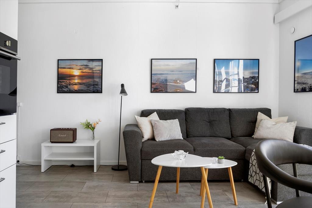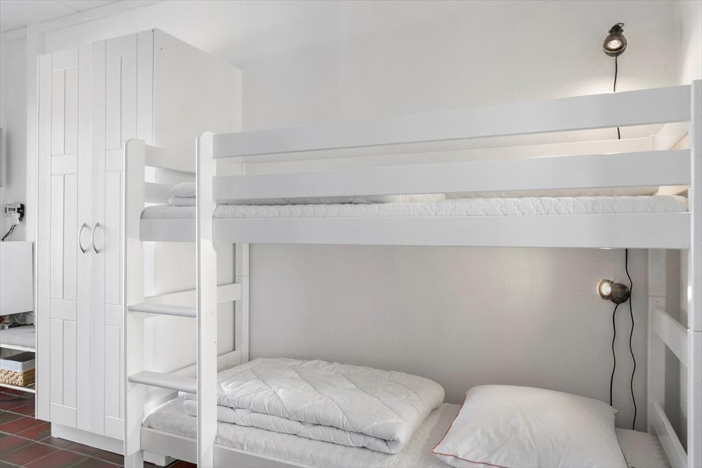 Inden døre i lejligheden er atmosfæren lys og indbydende. Alle rum er både pænt og funktionelt indrettet, så fire personer nemt kan finde sig godt til rette inden døre. Planløsningen byder på et badeværelse, et soveværelse med dobbeltseng og et gennemgangsværelse med køjeseng – og hvis du hellere vil sove i stuen, kan du rede op på den komfortable sovesofa. Stuen er også indrettet med spisebord og tv med både danske og tyske kanaler, og køkkenet er for øvrigt integreret med stuen, så madlavningen nemt kan blive del af feriesamværet.