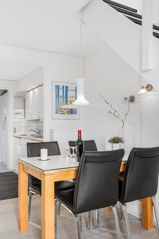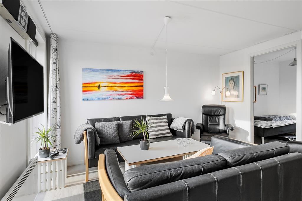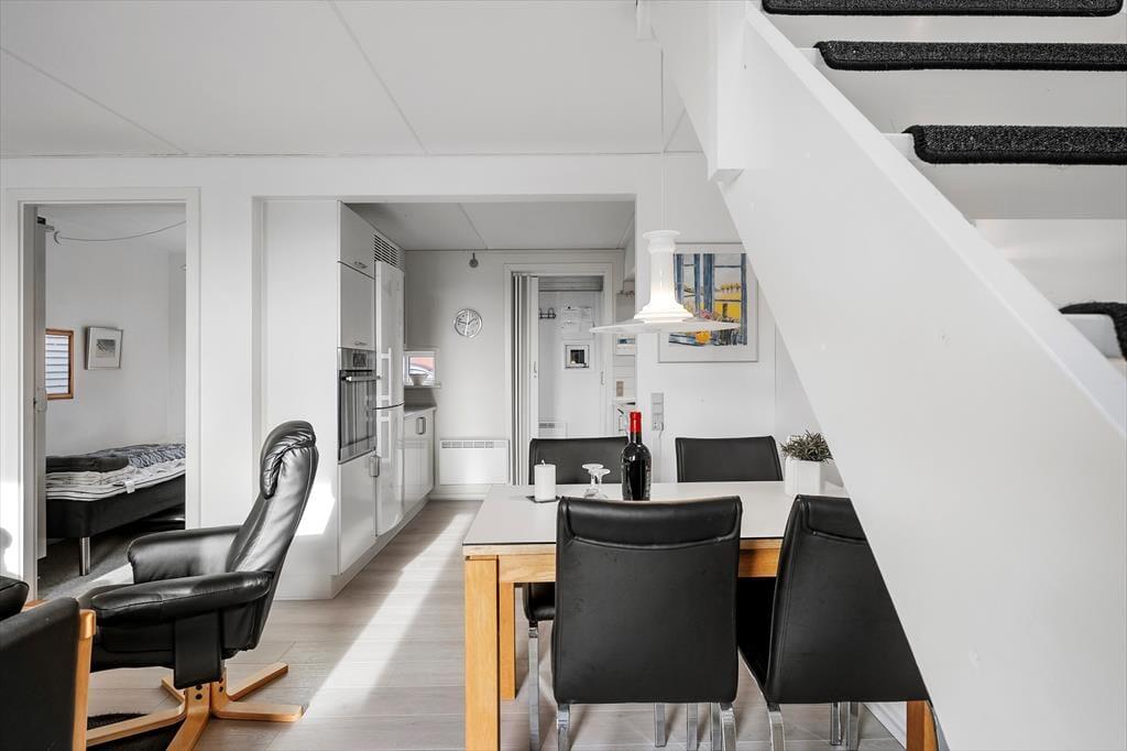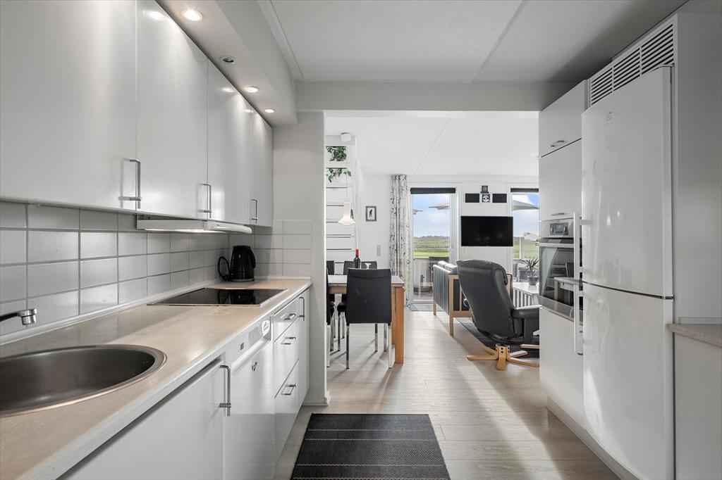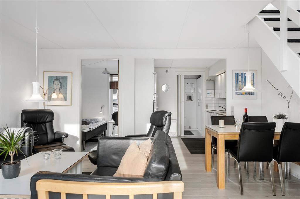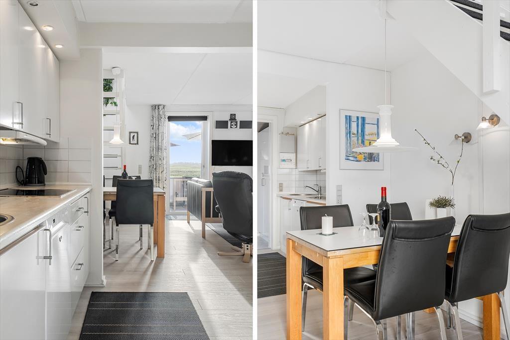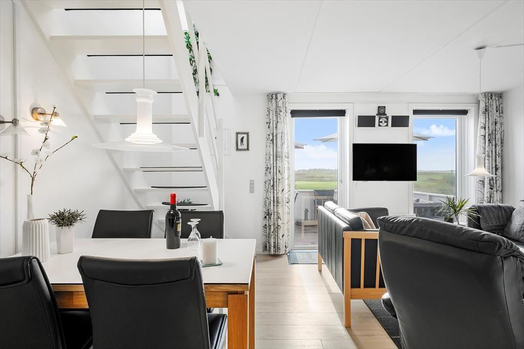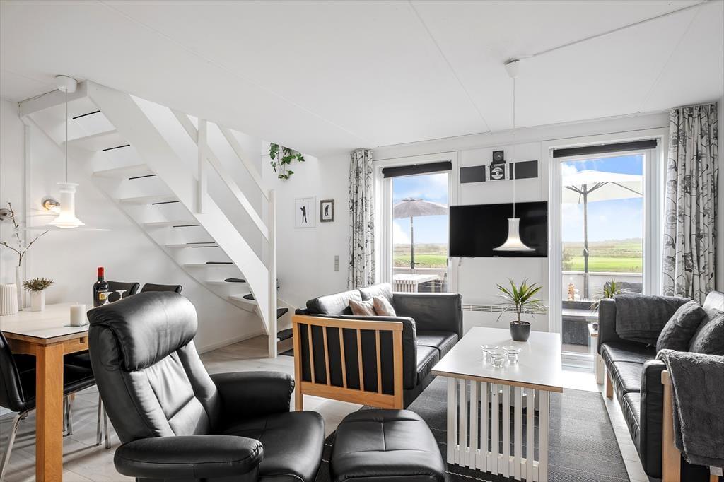Lejligheden har en glimrende planløsning til fem personer med et soveværelse i stueplan og to på førstesalen. Øverst ligger også et badeværelse, som ikke bare er med bruser, men også med vaskemaskine, hvis I skulle få brug for at vaske ispletter af tøjet i løbet af ferien. I stueplan ligger køkken og stue i åben forbindelse, så I kan holde hinanden med selskab, selv når en del af familien har madlavningstjansen – og også når I putter tallerknerne i opvaskemaskinen efter måltidet, kan I hyggesnakke og nyde familiesamværet. I stuen er det helt op til jer, om I vil tænde for en god film på fladskærmen eller bare nyde udsigten gennem vinduerne, hvis I altså ikke rykker driverlivet helt udenfor på den sydvestvendte terrasse.