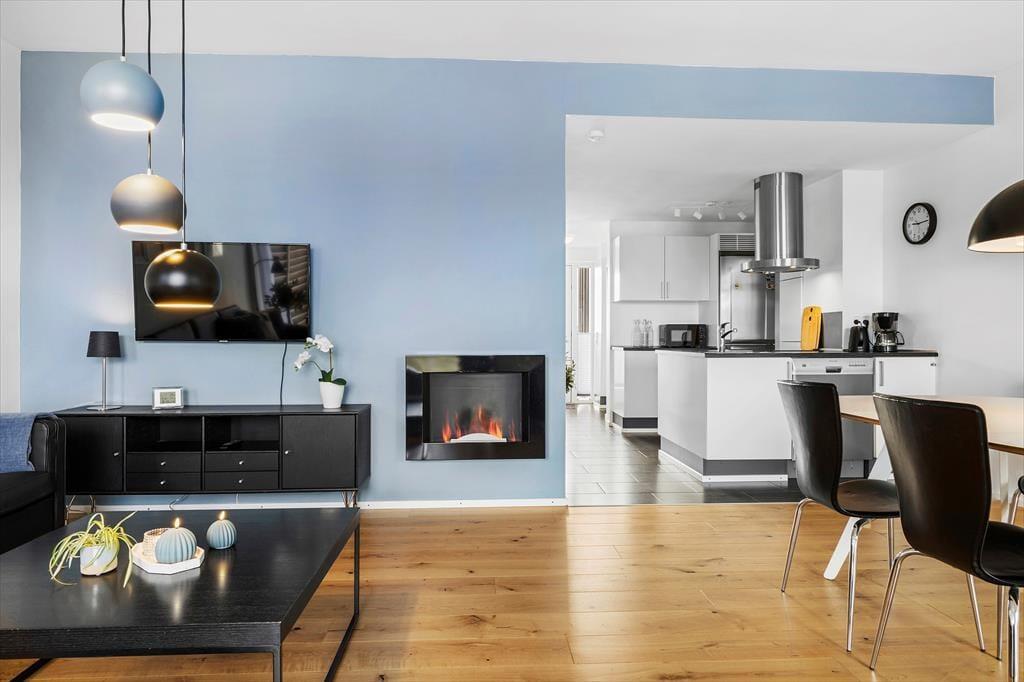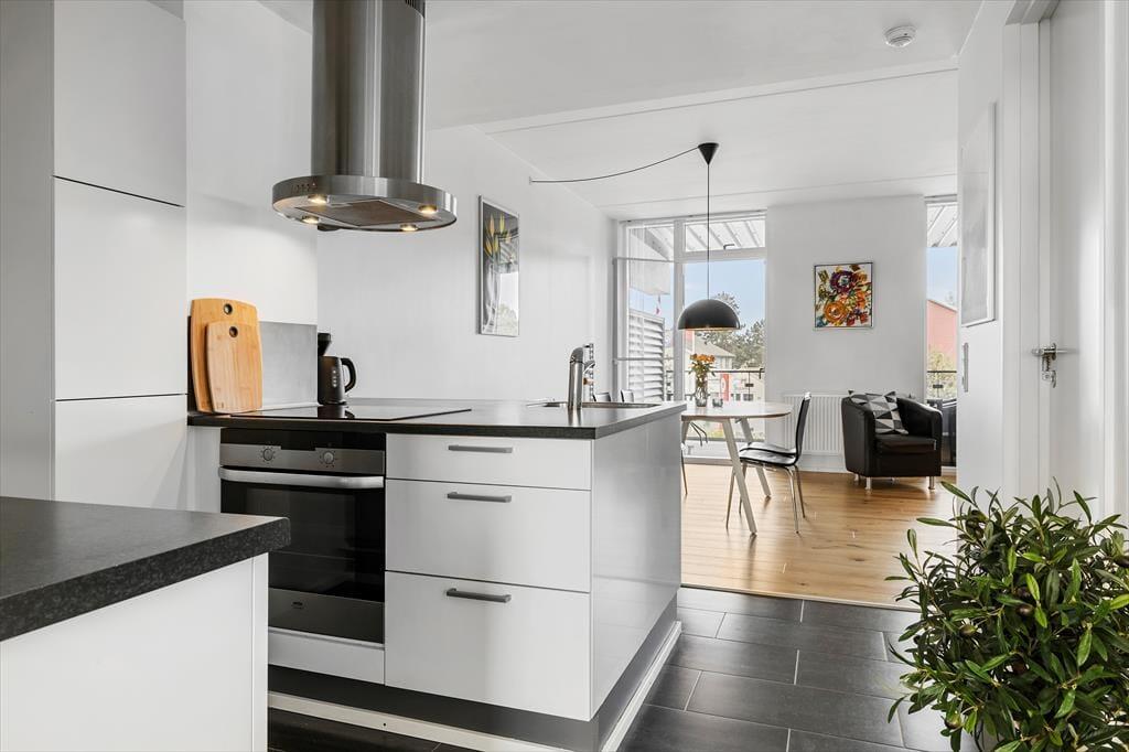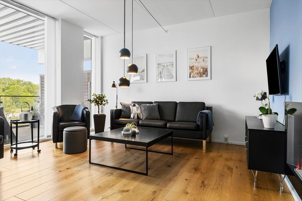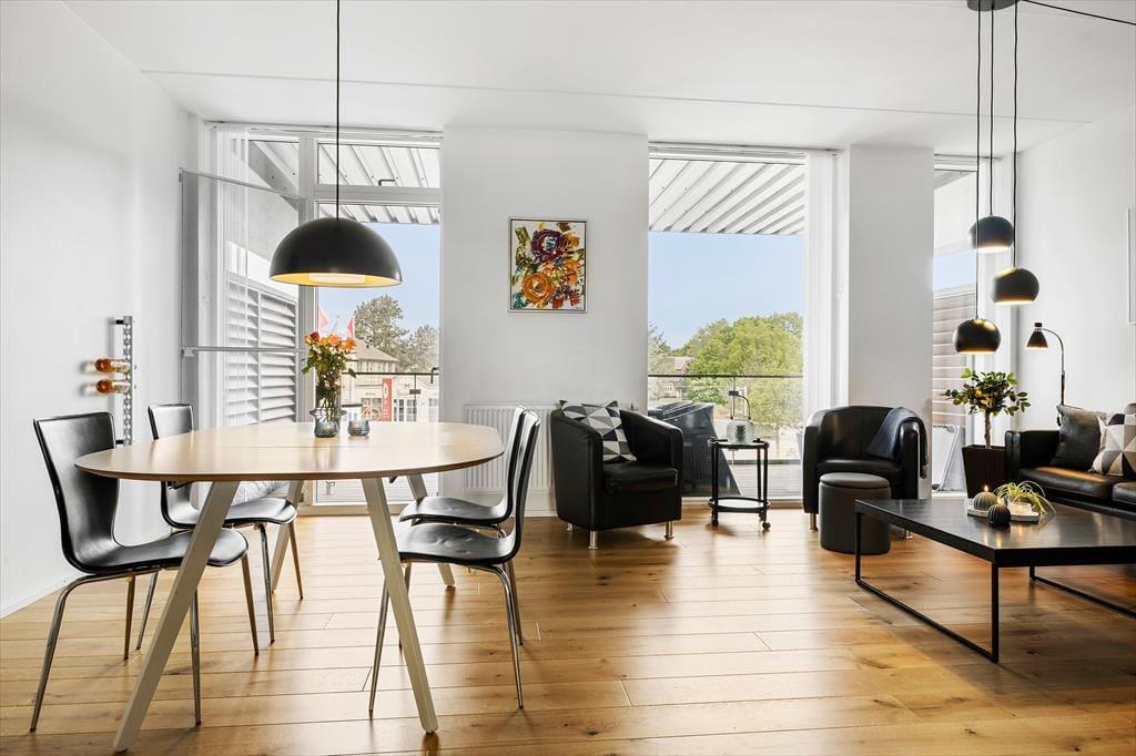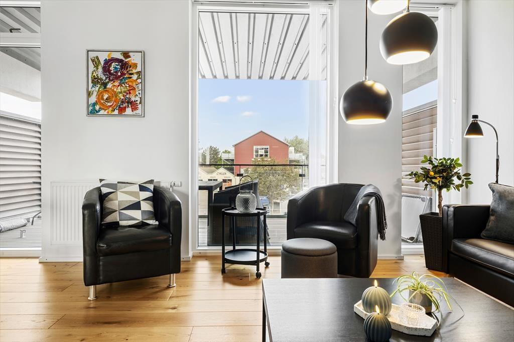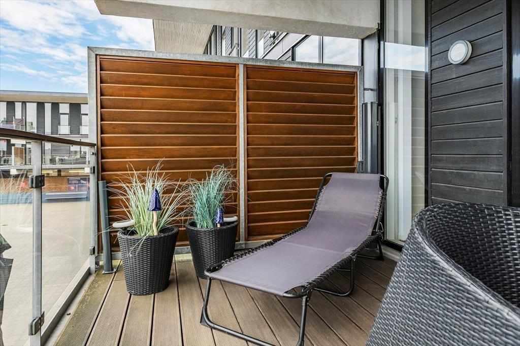 Hvis solen skinner, er det oplagt at rykke ud på en af lejlighedens to terrasser. Den ene vender mod øst og er et skønt sted at nyde morgenkaffen i dagens første solstråler. Den anden vender mod vest og ligger i direkte forlængelse af stuen. Her kan du sidde og følge med i livet på det hyggelige torv. Terrassen er udstyret med en liggestol, så hvis du holder af at dase med udkig til skyerne på himlen, er der rig mulighed for det. Det er også oplagt at dække op til en hyggelig middag, når dagen går på hæld – og da terrassen er overdækket, behøver du heller ikke bekymre dig så meget om vejrgudernes humør.