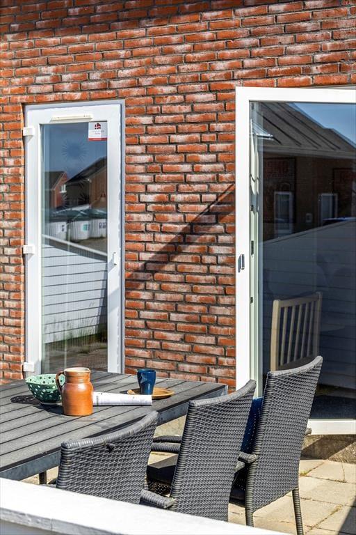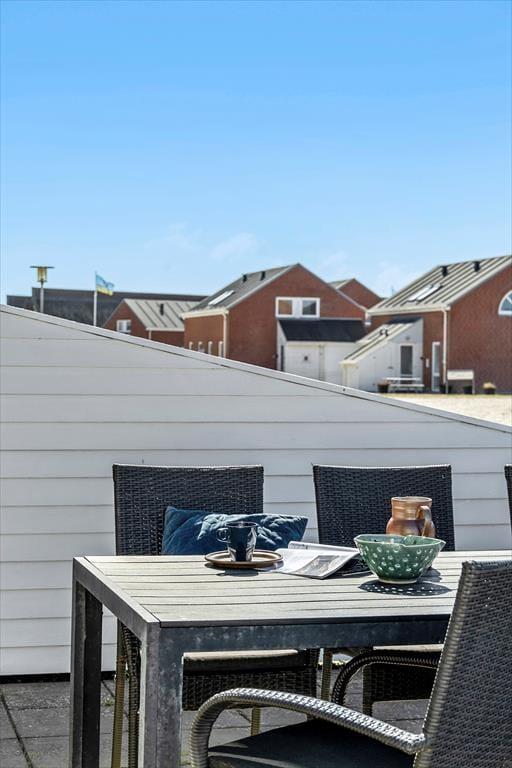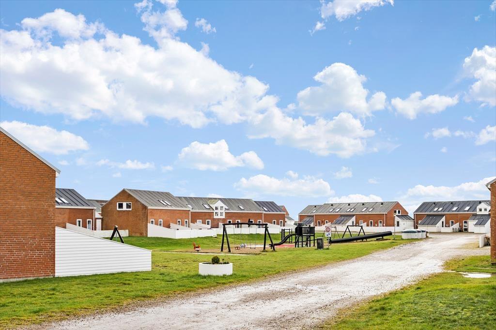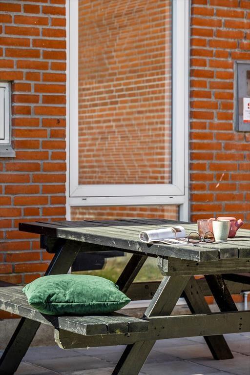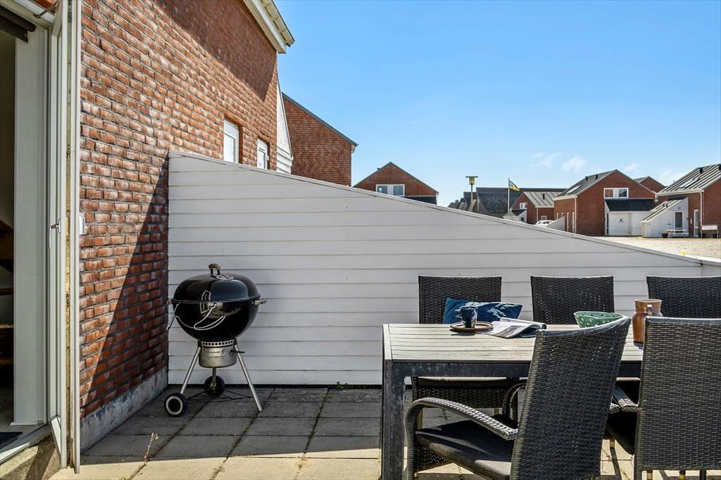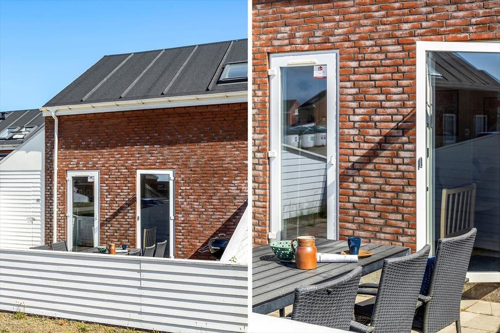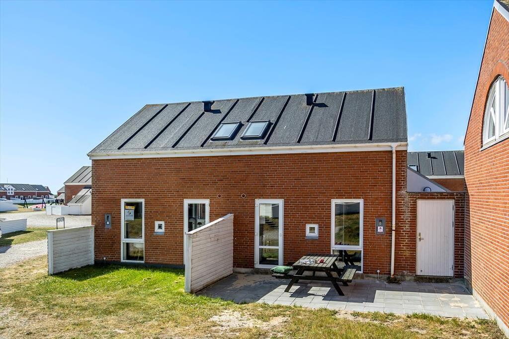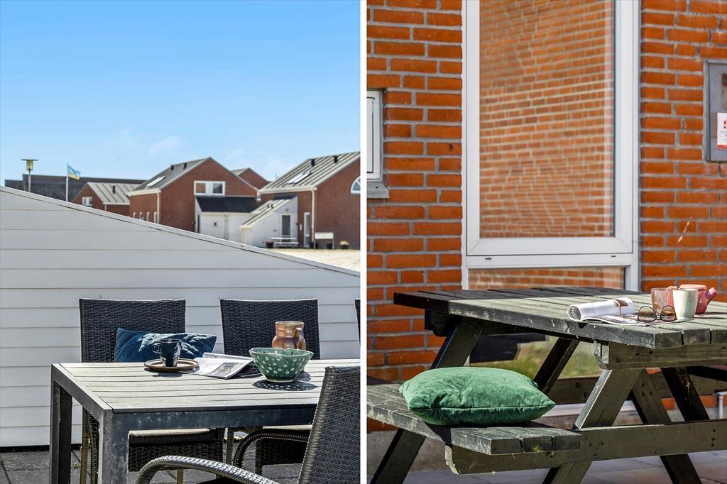Feriens hyggestunder kan også oplagt foregå ude i det fri, for i forlængelse af opholdsrummet venter en dejlig terrasse. Den er omkranset af et hvidt hegn, som skærmer tilpas af mod naboerne, og samtidig er det nemt at smutte gennem lågen, når I vil hen med børnene, så de kan boltre sig på legepladsen, eller når I sammen vil spille minigolf og tennis eller have et dyp i swimmingpoolen. Der er et væld af fællesfaciliteter at vælge imellem i feriecentret – mange er inkluderet i prisen og andre kan benyttes mod betaling – og når I er ved at blive sultne, kan I vende hjem til terrassen for at grille og nyde den lyse sommeraften.