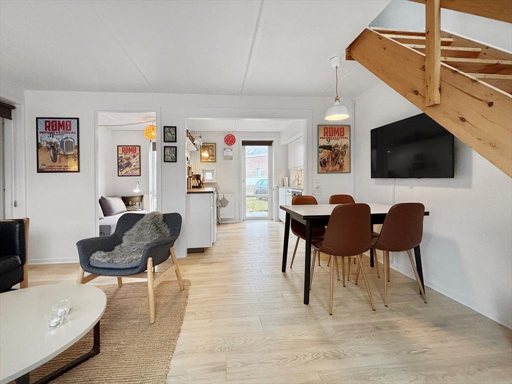 Inde bag sommerhusets solide rødstensmure venter der dig og dine kære et lyst og velindrettet feriehjem: Her kan I få en hyggelig og tryg ramme om madlavning, nattesøvn og alskens indendørs afslapning, uanset om I vil læse bøger i sofaen, se film på fladskærms-tv’et eller se, hvem der kan vinde i Uno eller andre kortspil flest gange. I stueplan ligger stue og køkken i åben forbindelse, og der er også et enkelt soveværelse, mens yderligere to soveværelser er placeret på førstesalen sammen med et rummeligt badeværelse. Alle rum har en enkelt og stilfuld indretning, og planløsningen passer fint til seks personer – så måske er der ligefrem mulighed for at invitere bedsteforældrene eller et par gode venner med på ferie.