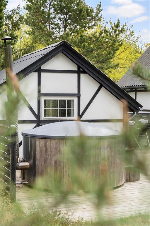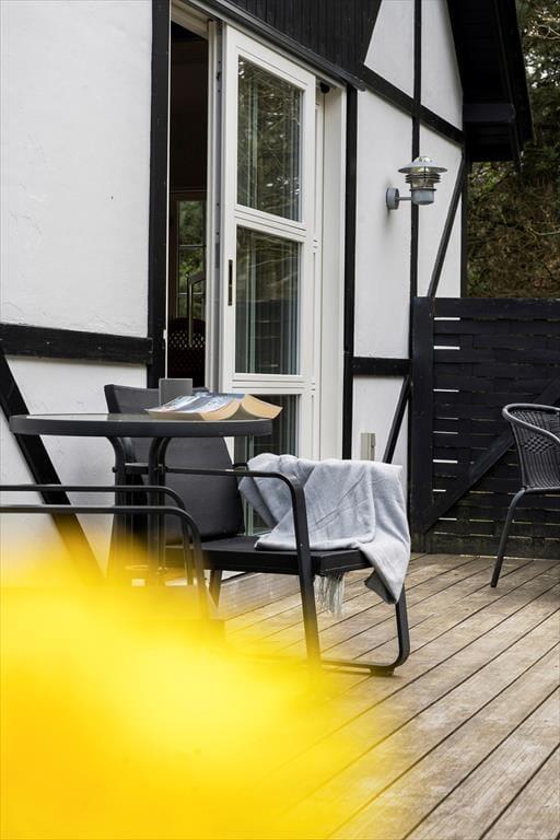 Når du træder indenfor, bliver du mødt af en varm og indbydende atmosfære, hvor charme og tradition spiller hovedrollen. Det specielle bindingsværkshus emmer af hyggelig sommerhushygge med sine trælofter med bjælker og den centrale brændeovn, der kan sprede varme og stemning på kolde eftermiddage eller aftener. Det er et område, der indbyder til socialt samvær. Et rum hvor I kan sidde sammen, nyde hinandens selskab og lytte til den knitrende ild. Det store opholdsområde er det naturlige centrum, hvor det hyggelige interiør er kombineret med store vinduer, der lukker den omkringliggende natur ind, så skov, træer og rolig daggryssol synger med i sommerhusets ægte landlige stemning.