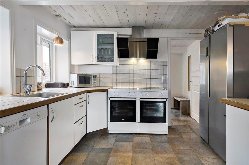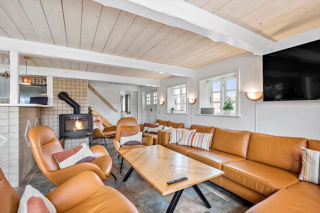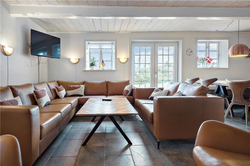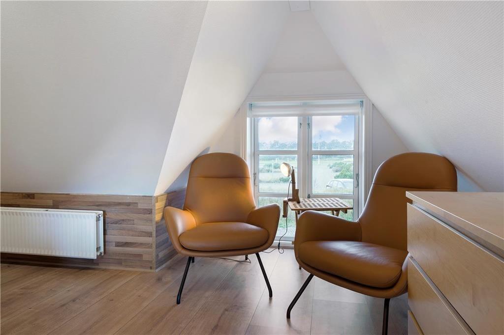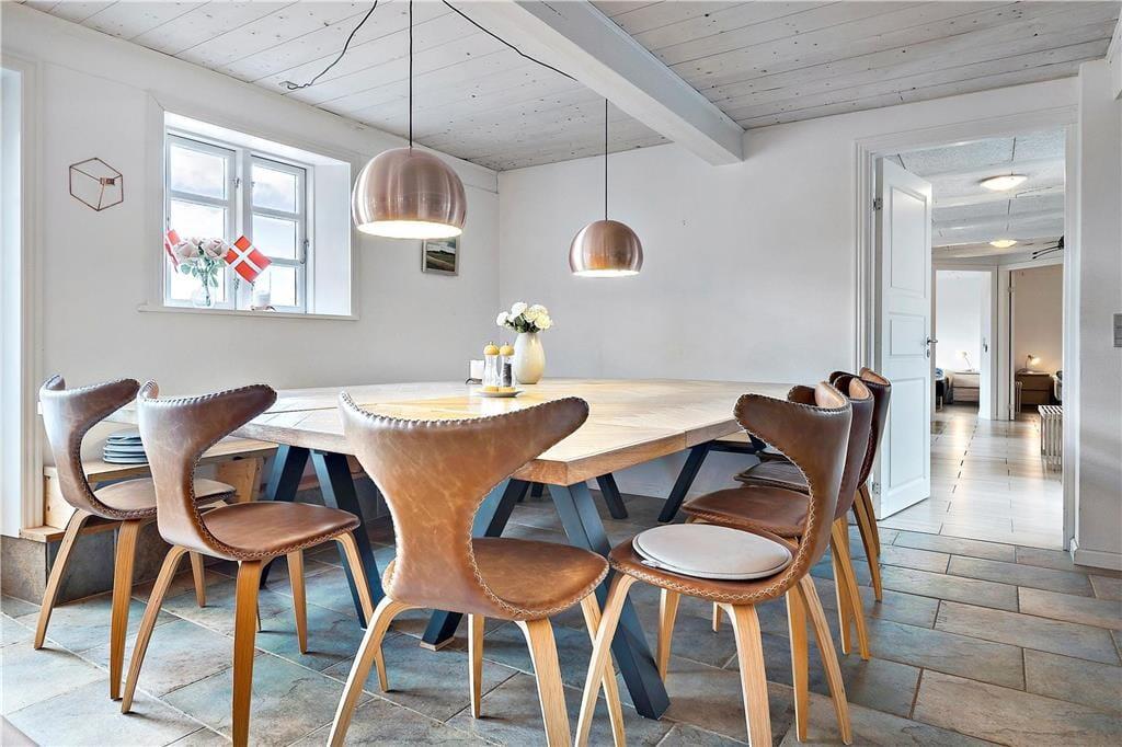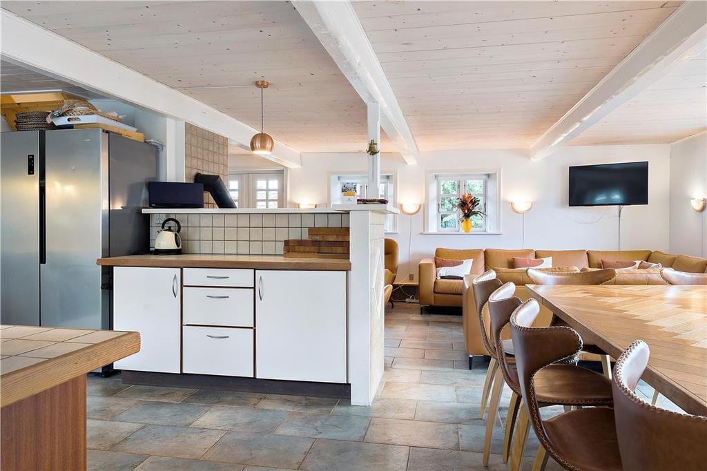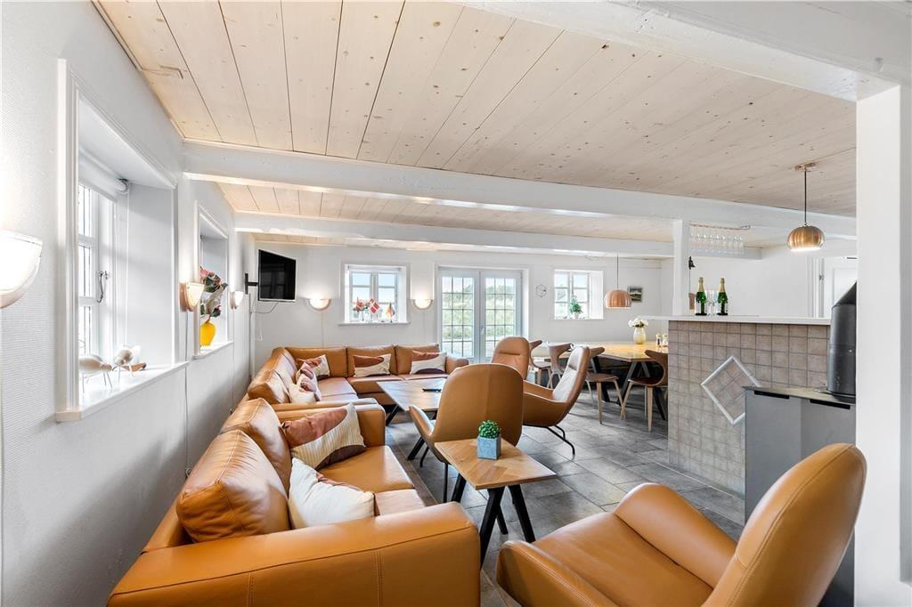 Huset, som oprindeligt er fra 1827, er blevet renoveret efter alle kunstens regler. Her får I lige dele moderne komfort og autentisk Rømø-charme med stråtag, pudset facade og sprossevinduer. Indvendig er der en utroligt indbydende atmosfære, og man mærker, at renoveringen er foretaget med stor respekt for den oprindelige stil. Hjertet i huset er det store opholdsrum, hvor køkken, alrum og stue ligger i åben forbindelse. Synlige loftsbjælker og rustikke gulvklinker tilfører masser af stemning. I køkkenet er der god arbejdsplads og dobbelt op på ovn og komfur. Alrummet er indrettet med et stort spisebord, hvor alle kan samles omkring måltiderne. Herudover er der en stor sofagruppe og en hyggelig krog med lænestole omkring brændeovnen. Der er i alt otte værelser i huset – fire dobbeltværelser i stueplan samt to dobbeltværelser og to enkeltværelser på førstesalen. Endelig er der tre badeværelser.