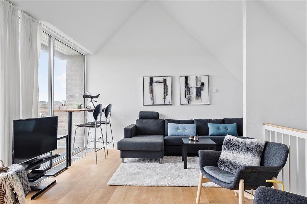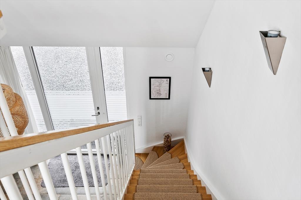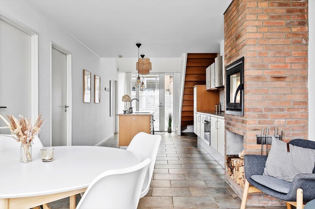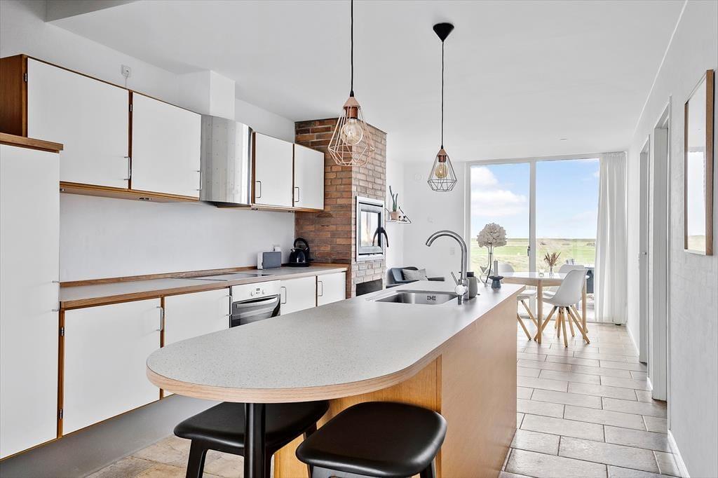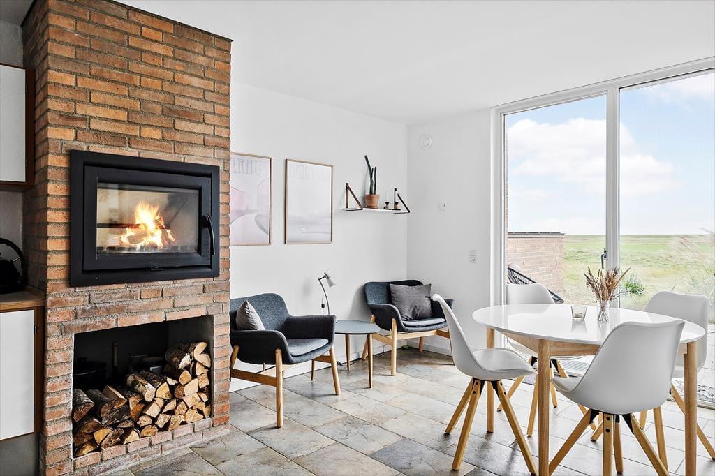 Med 97 m² inden døre er der god plads til fire personer, og I har endda to opholdsrum at vælge imellem, når I vil bruge tiden sammen. Det store køkken-alrum i stueplan er et godt sted at samles, når I vil lave mad eller bare hygge jer nær indbygningspejsen. Spisebordet er placeret lige ved vinduet, så I kan kigge lige ud på det grønne landskab, når I drikker kaffe eller spiser frokost – og vuet bliver blot endnu bedre, når I rykker op på førstesalen for at slappe af i den lyse og velindrettede stue. Naturudsigten kan for øvrigt også nydes fra det ene af stueplanets to soveværelser, der begge er indrettet med garderobeskabe og gode dobbeltsenge. Imellem de to værelser ligger et badeværelse, og det har en pæn og moderne indretning præcis ligesom de øvrige rum.