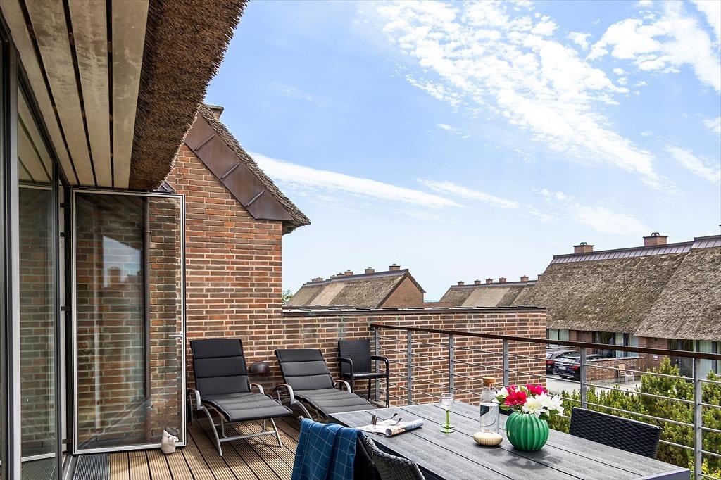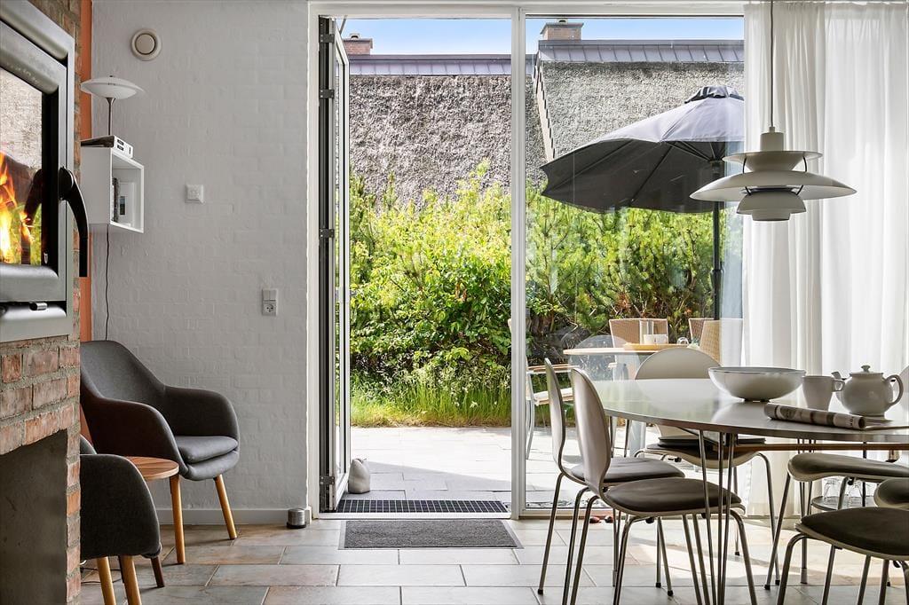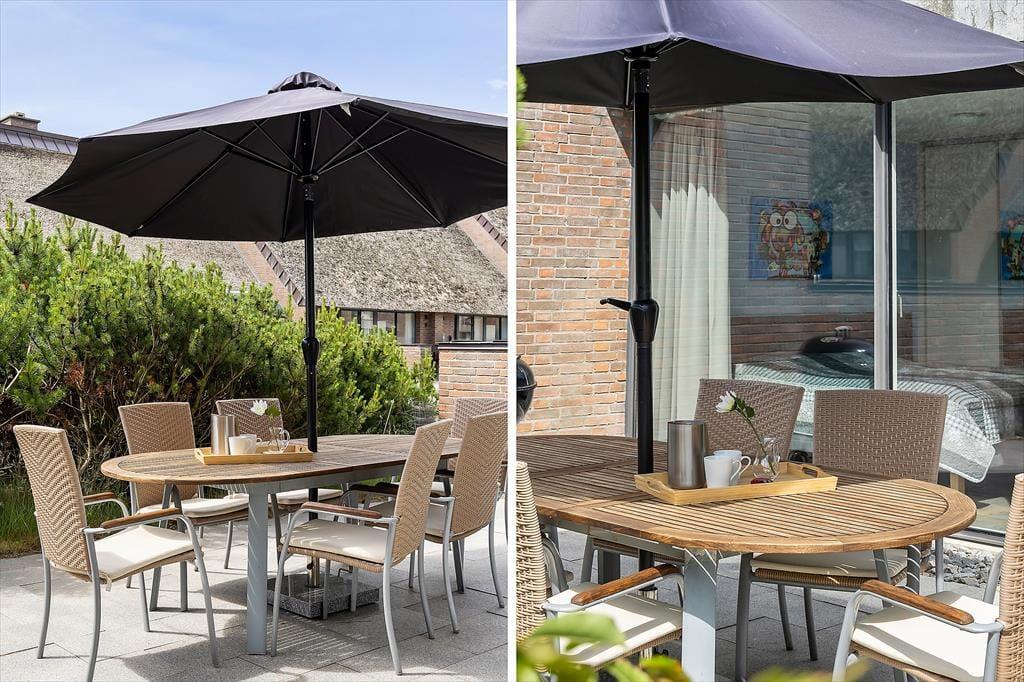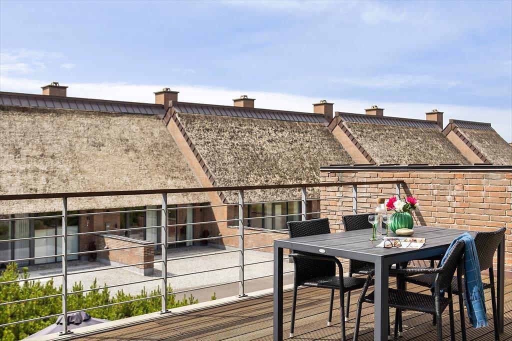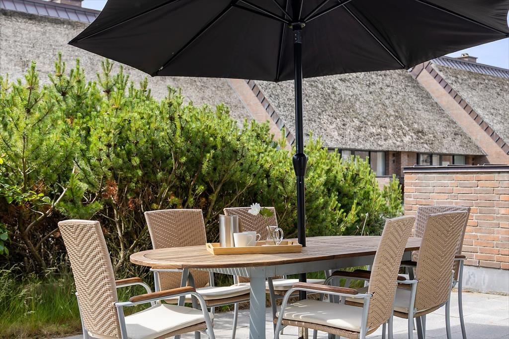 Når vejret er godt, har I flere skønne opholdspladser at vælge imellem ude i det fri. Den sydvendte terrasse ligger i forlængelse af køkken-alrummet, så det er oplagt at flytte morgenmaden og frokosten herud – og at tilberede aftensmaden på grillen under åben himmel. Det kan nu også anbefales at rykke driverlivet op på førstesalens store altan, der ligeledes er sydvendt og dermed dejligt solrig.