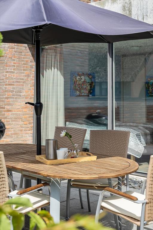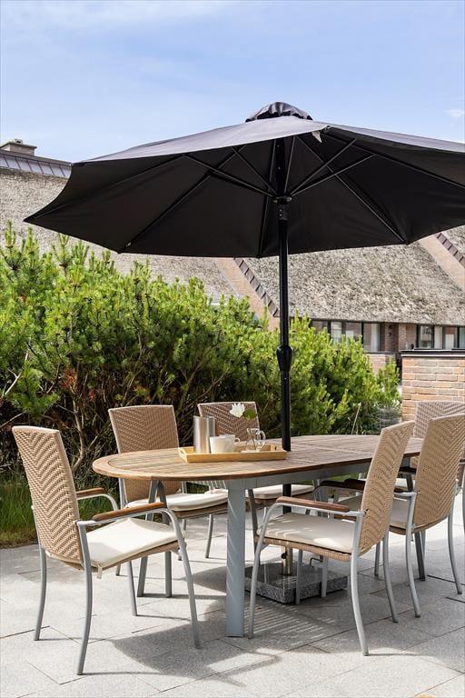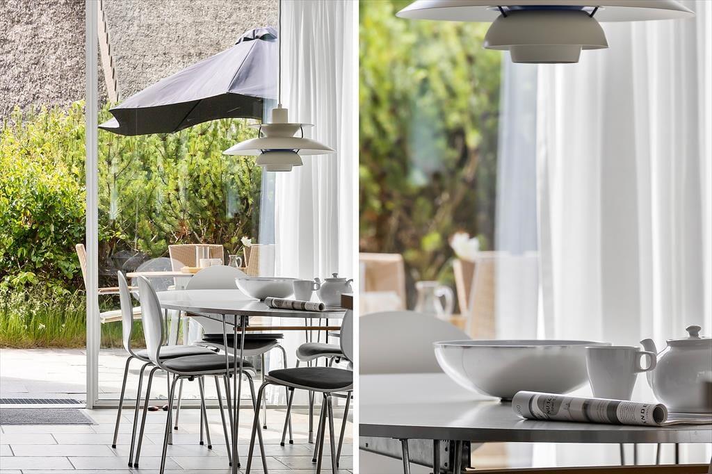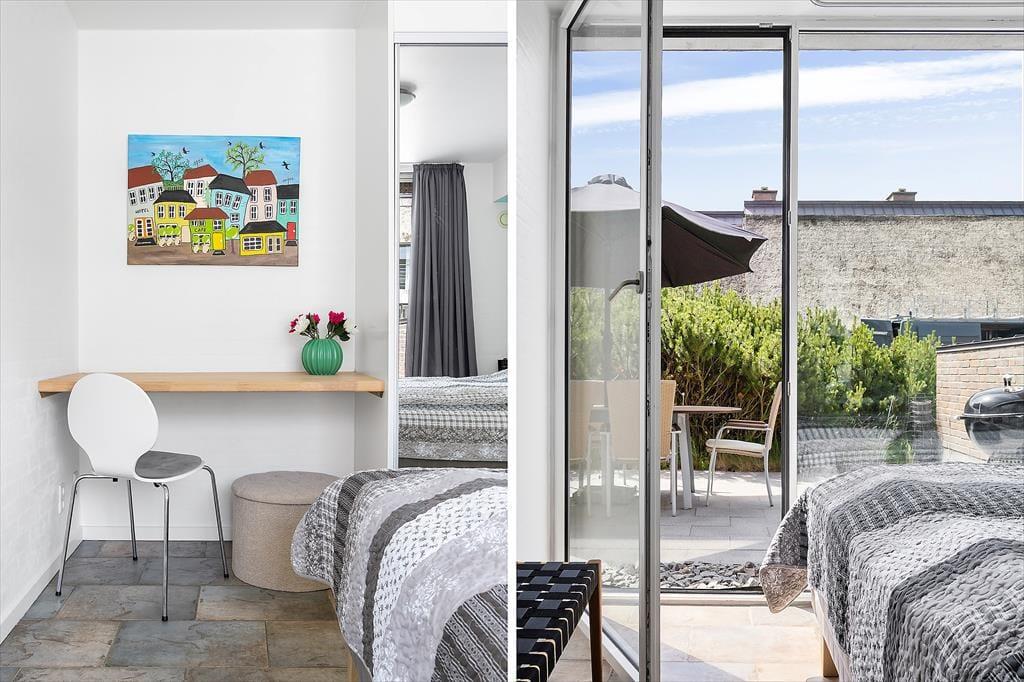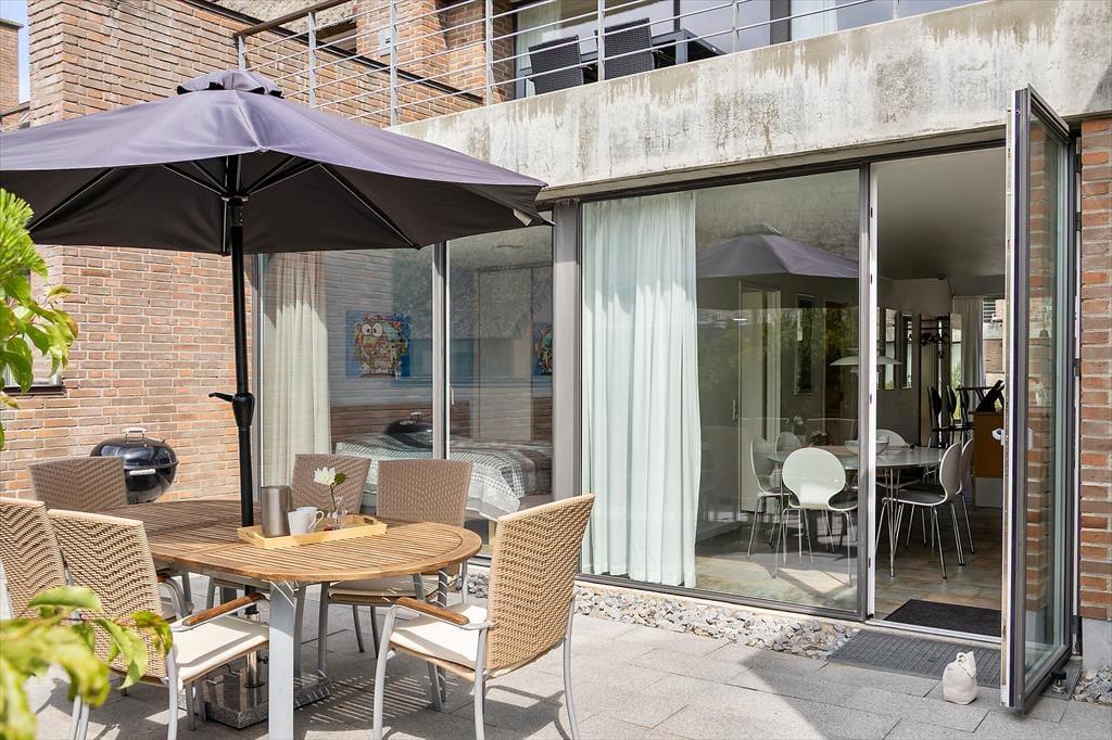 Når vejret er godt, har I flere skønne opholdspladser at vælge imellem ude i det fri. Den sydvendte terrasse ligger i forlængelse af køkken-alrummet, så det er oplagt at flytte morgenmaden og frokosten herud – og at tilberede aftensmaden på grillen under åben himmel. Det kan nu også anbefales at rykke driverlivet op på førstesalens store altan, der ligeledes er sydvendt og dermed dejligt solrig.