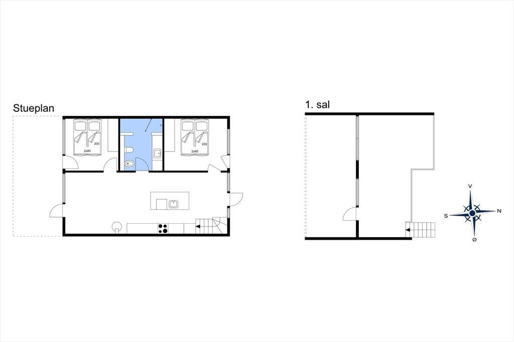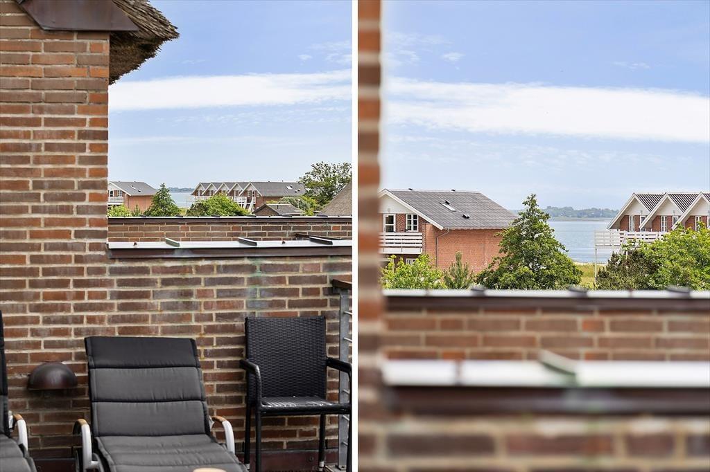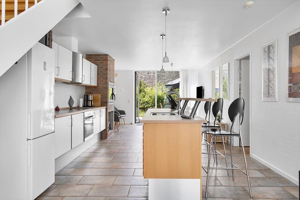 Sommerhuset, der nærmere bestemt er et stråtækt rækkehus fra 2007, har en glimrende planløsning på 112 m² fordelt på to plan. I stueplan er køkken og spisestue forenet som et stort og indbydende opholdsrum med gennemstrømmende lysindfald og stilfuldt møblement. Mens I hygger jer med madlavningen eller sidder samlet omkring spisebordet, kan I nyde varmen og skæret fra ilden i indbygningspejsen – hvis det altså ikke nærmere er vejr til at lade frisk luft strømme ind gennem terrassedøren. I kan også gå ovenpå for at slappe af i den flotte opholdsstue, der har loft til kip og et kæmpe sydvendt vinduesparti. En af sofaerne er en dobbelt sovesofa, så den kan oplagt fungere som sengeplads om natten, hvis dobbeltsengene på husets to soveværelser ikke rækker. Et badeværelse rummer huset selvfølgelig også, og det er lige så velindrettet som de øvrige rum.