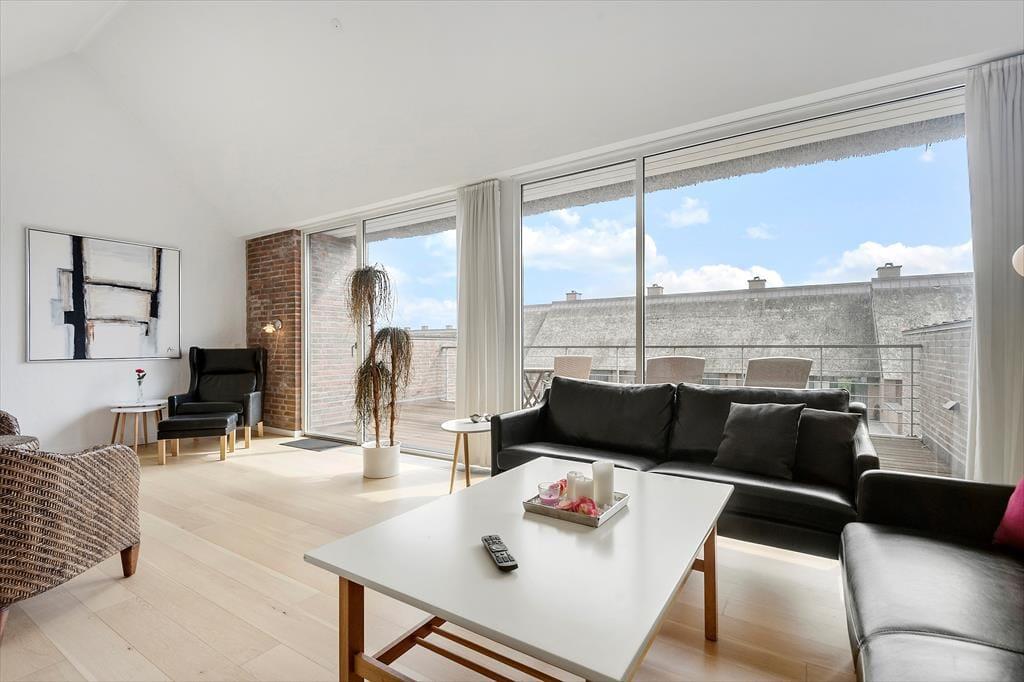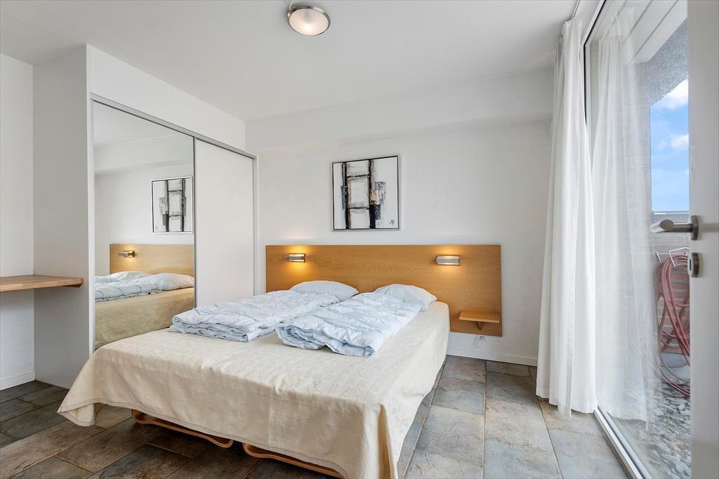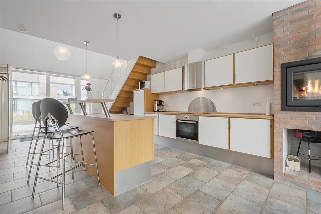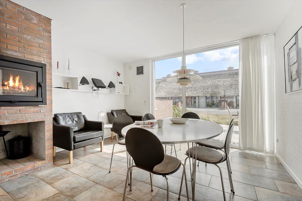 Atmosfæren er lys og luftig inden døre i de velindrettede rum. Store vinduespartier inviterer solen indenfor, og det stilrene interiør giver et elegant helhedsindtryk overalt i ferieboligen. I alt kan I brede jer på 112 m² fordelt på to etager, så seks personer kan få det bekvemt her. Stueplan byder på to gode soveværelser, et rummeligt badeværelse og en kombineret spise- og opholdsstue, som ligger i åben forbindelse med et veludstyret køkken. Ligesom i stueetagens øvrige rum er der gulvvarme i opholdsrummet, og indbygningspejsen kan fungere som en ekstra varmekilde og hyggespreder på kølige aftner. Hyggestunderne kan også finde sted ovenpå, hvor I kan slå jer ned i de bløde siddemøbler i den højloftede stue. Her er også en sovesofa, og der er gardiner til det store vinduesparti, hvis stuen skal bruges som sovegemak.