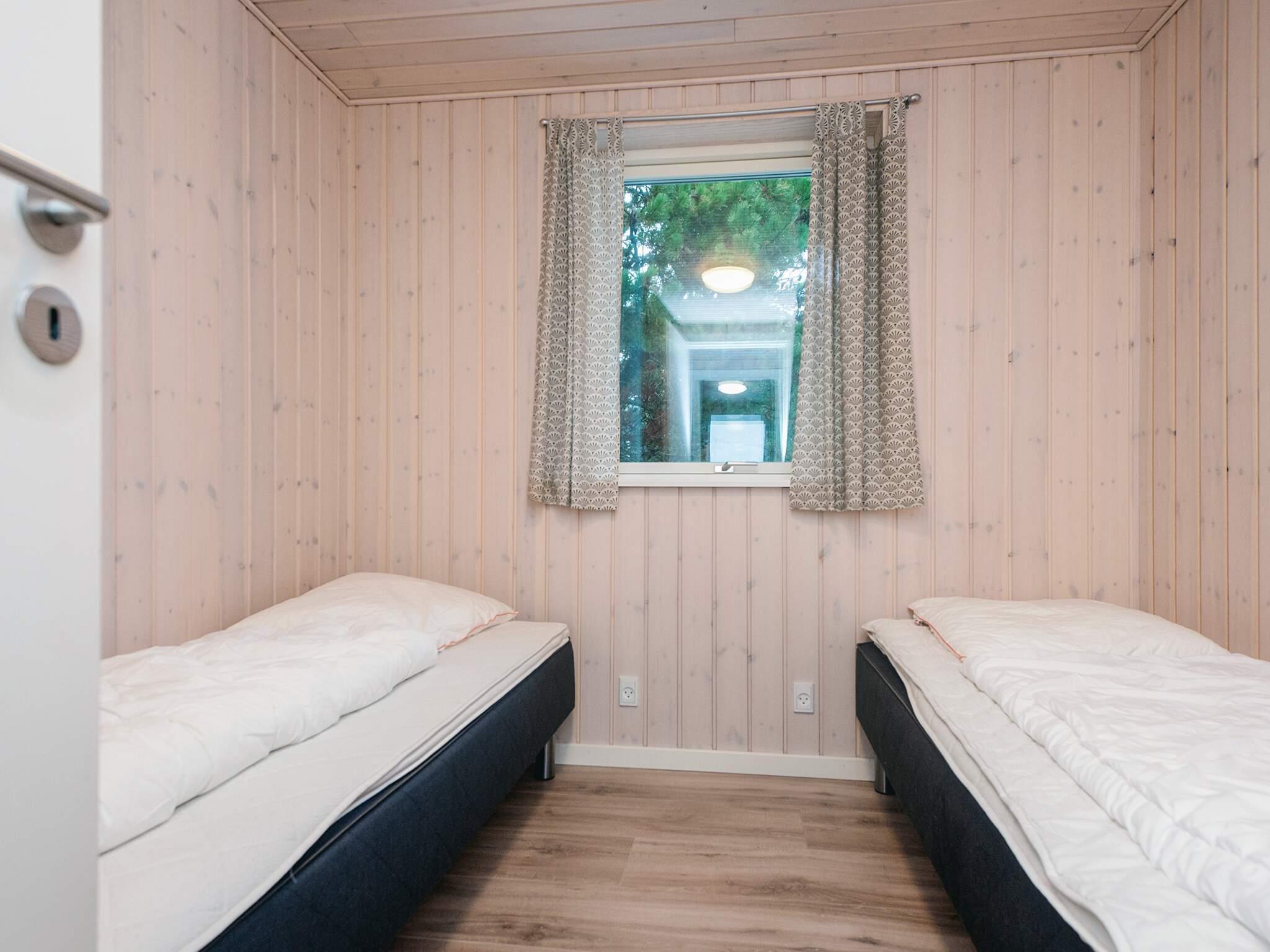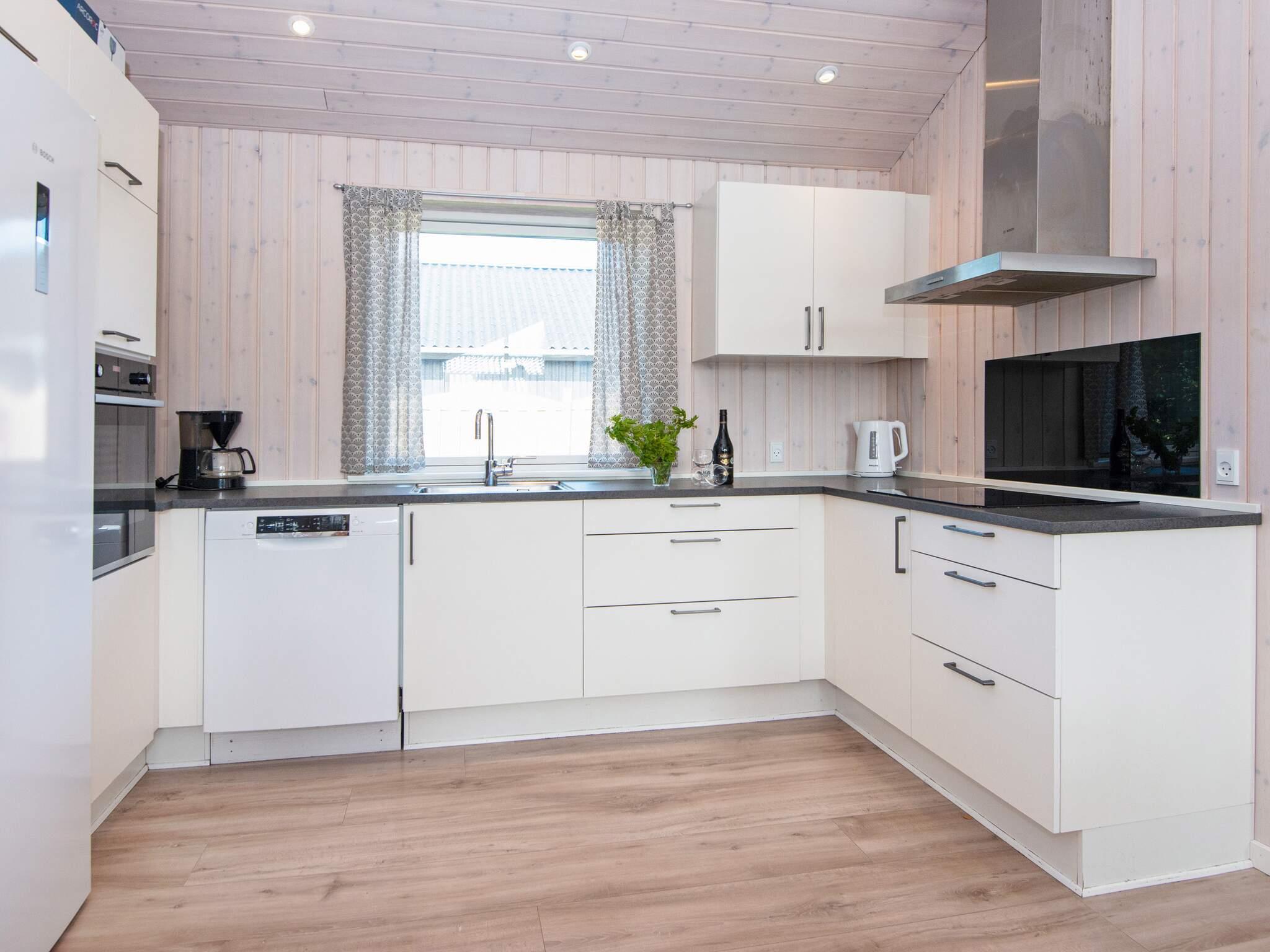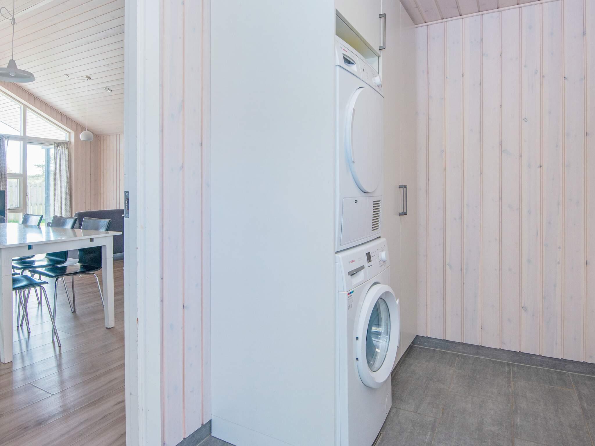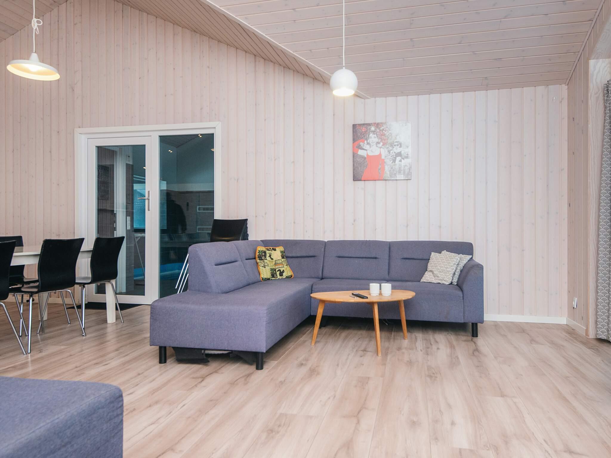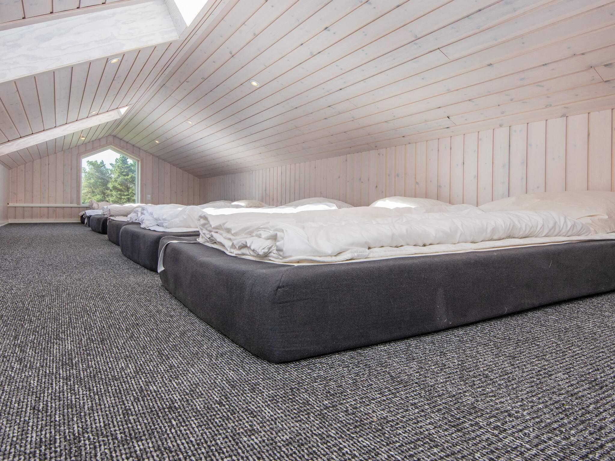Dette moderne feriehus er veludstyret til flere familier med sine fem soveværelser og en stor hems med seks senge, der kigger ned i stuen. Der er tre badeværelser med bruser, hvoraf det ene ligger i poolrummet.