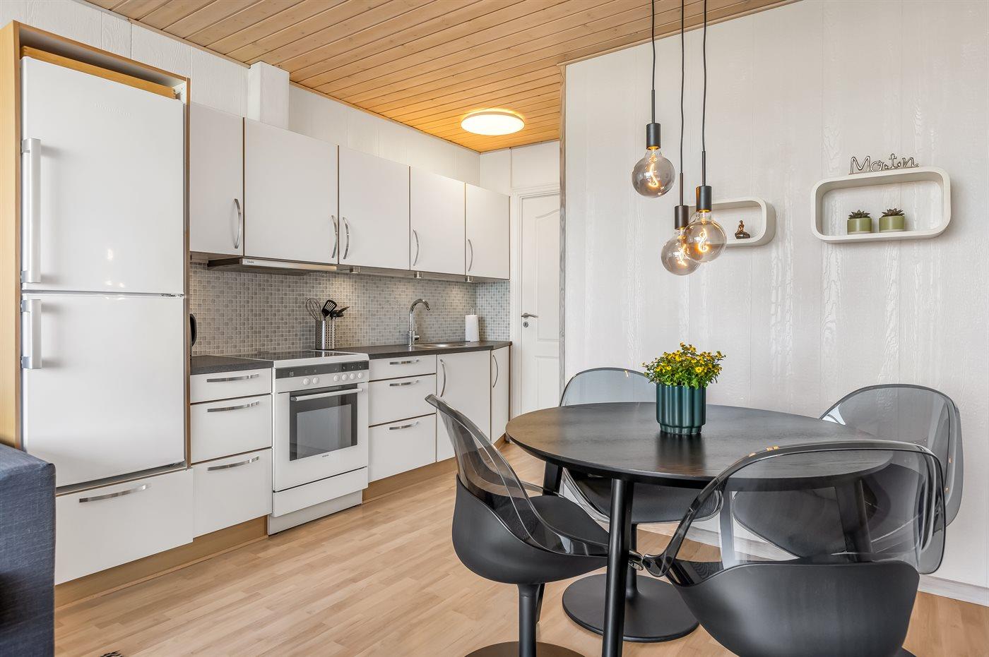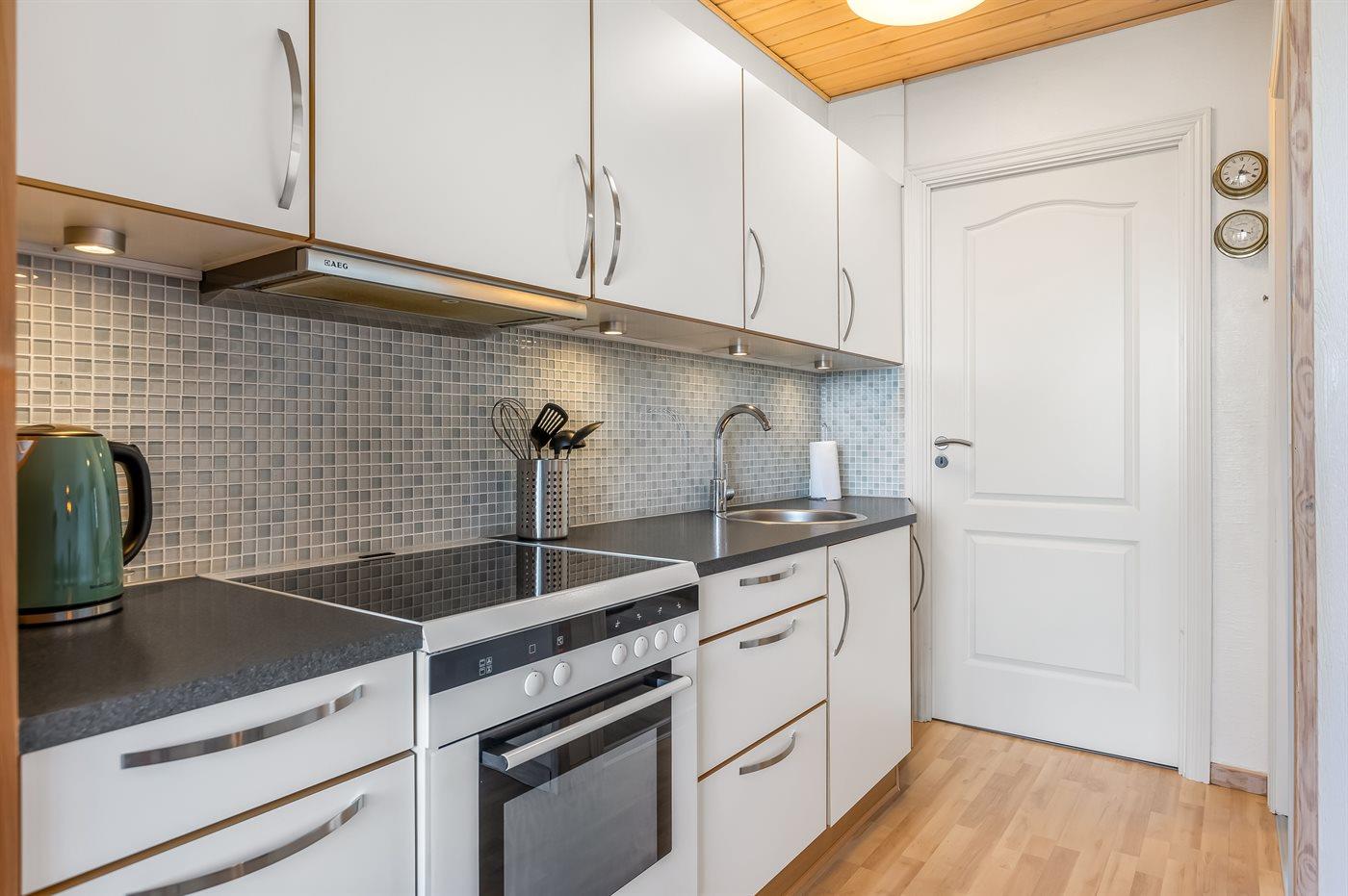 Køkkenet er udstyret med 1 køleskab. Der er 4 keramiske kogeplader, varmluftovn.