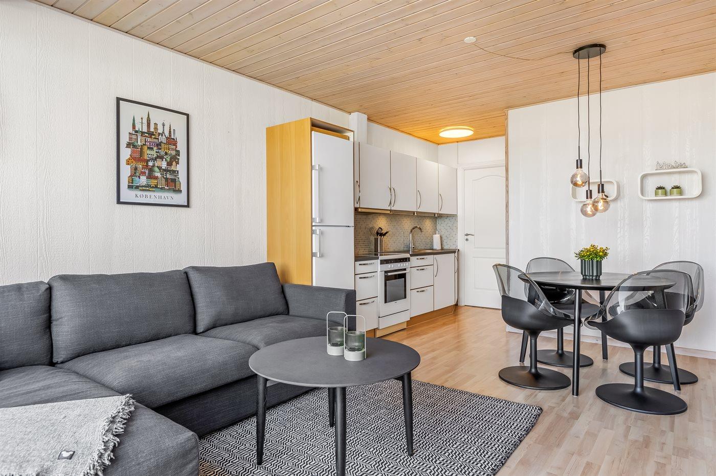 I denne flotte lejlighed har du udsigt over vandet fra terrassen og fra stuen. Her er du tæt på indkøb og diverse forretninger.