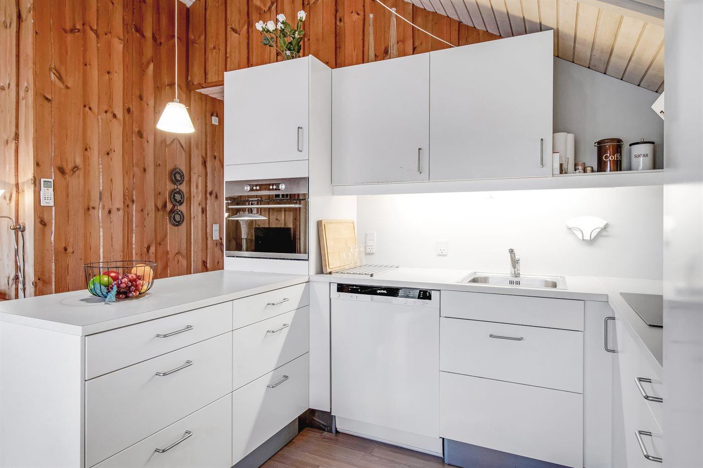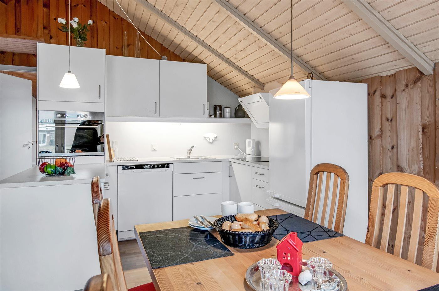 Køkkenet er udstyret med 1 køleskab. Der er 4 induktionskogeplader, varmluftovn, mikrobølgeovn samt opvaskemaskine. Der er 1 badeværelse med bruseniche og 1 toilet.
