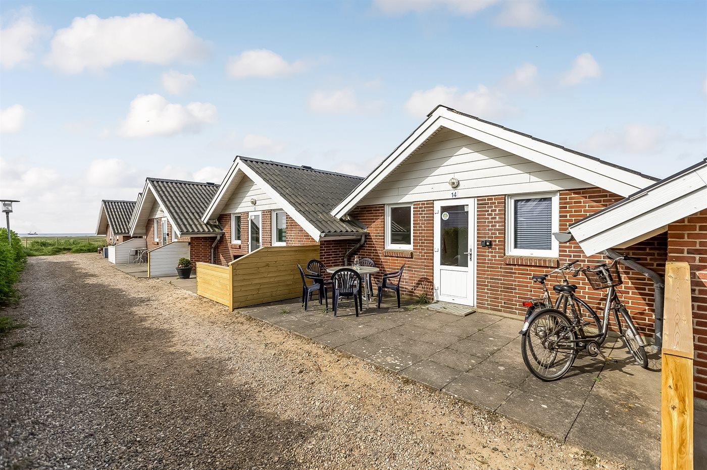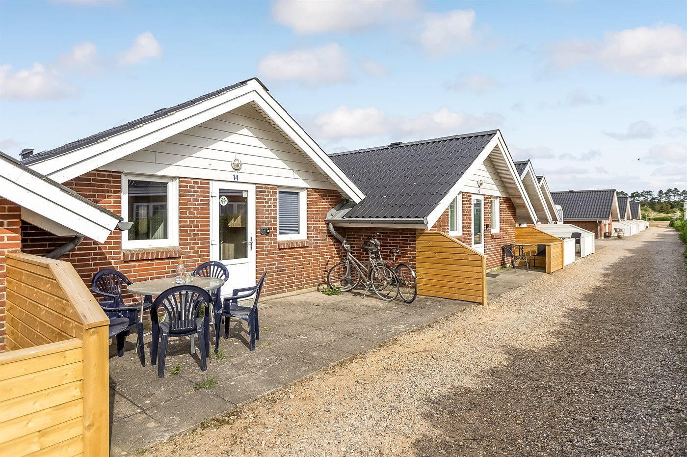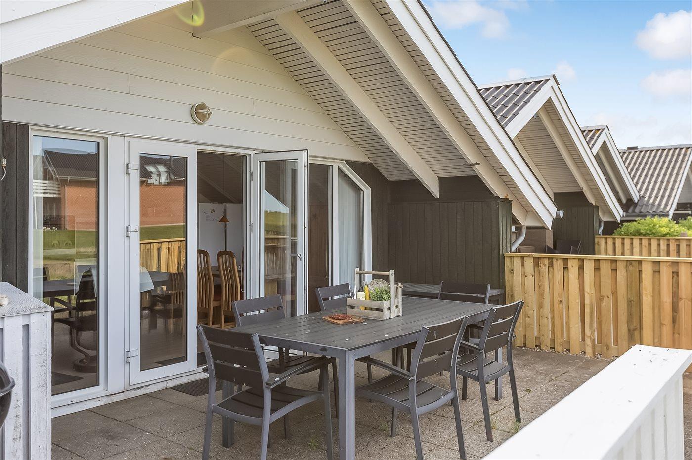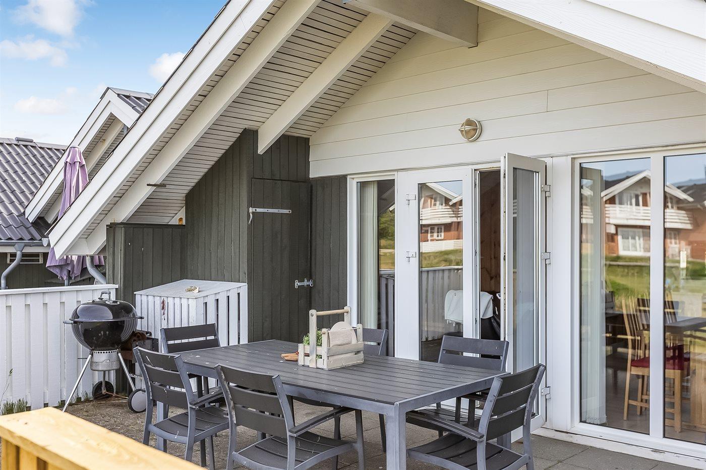 Til ferieboligen hører 2 terrasser - østvendt og vestvendt. Grill til rådighed. Parkering for enden af lejlighedsrækken.