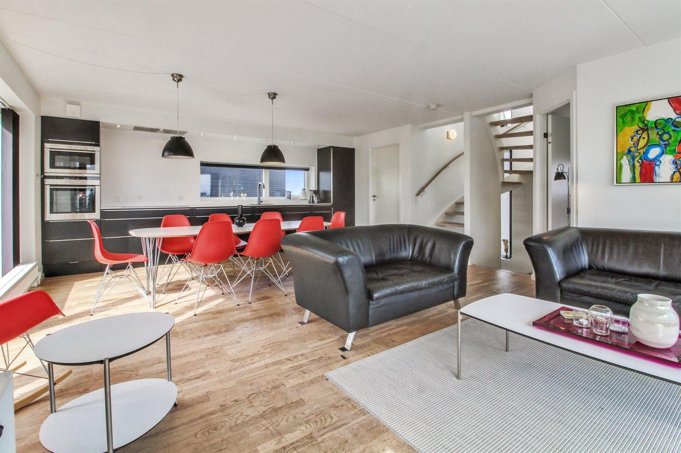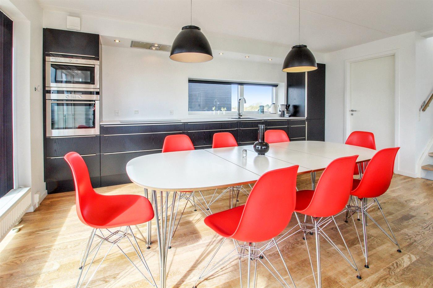 Køkkenet er udstyret med 1 køleskab. Der er 4 keramiske kogeplader, varmluftovn, mikrobølgeovn samt opvaskemaskine.