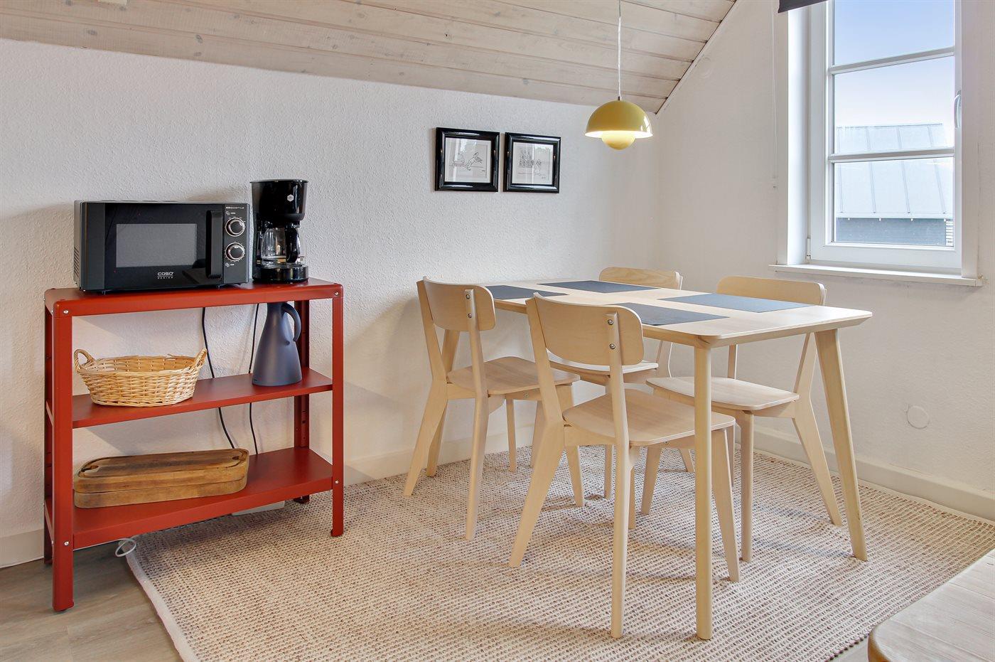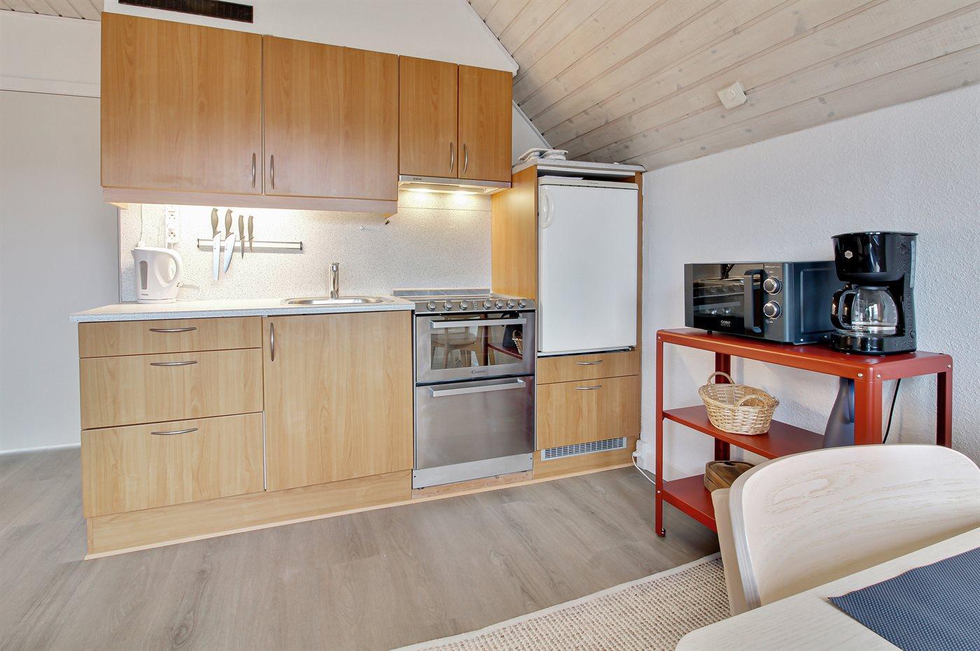 Køkkenet er udstyret med 1 køleskab. Der er 4 keramiske kogeplader, varmluftovn, mikrobølgeovn samt opvaskemaskine.