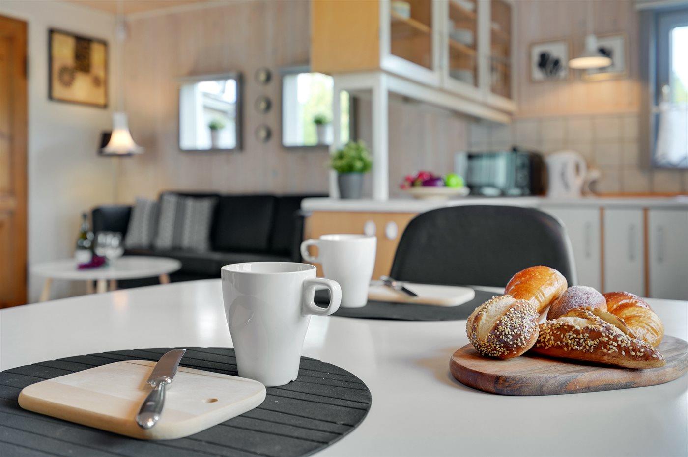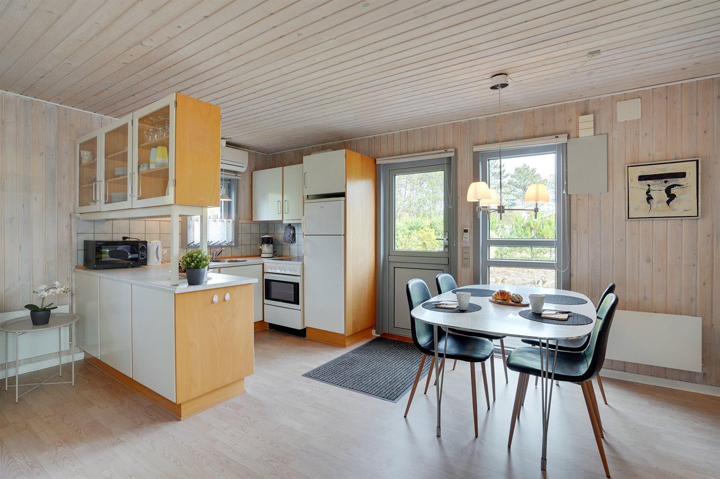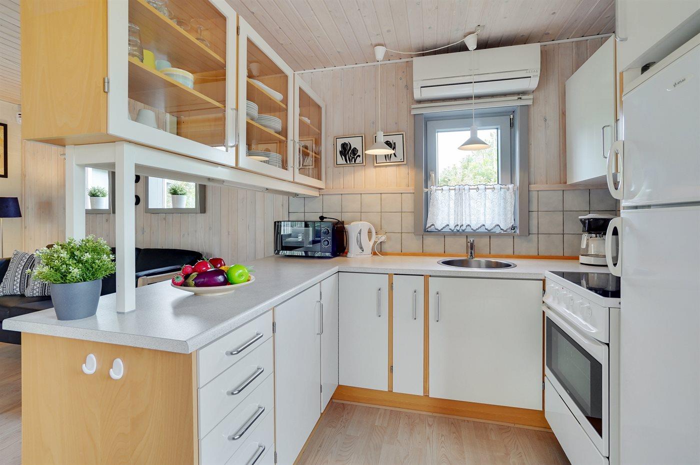 Køkkenet er udstyret med 1 køleskab. Der er 4 keramiske kogeplader, varmluftovn, mikrobølgeovn.
