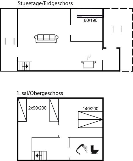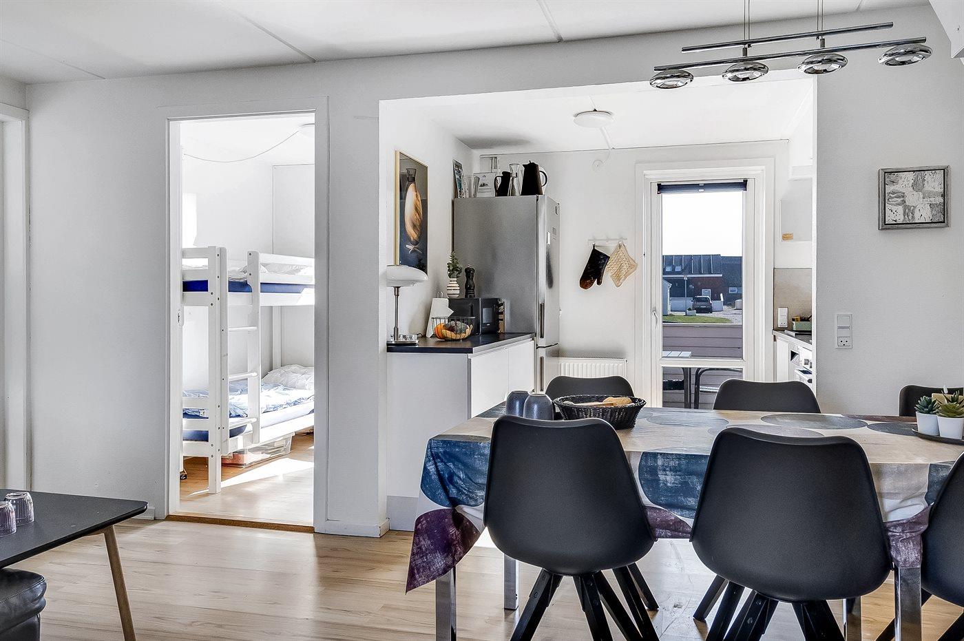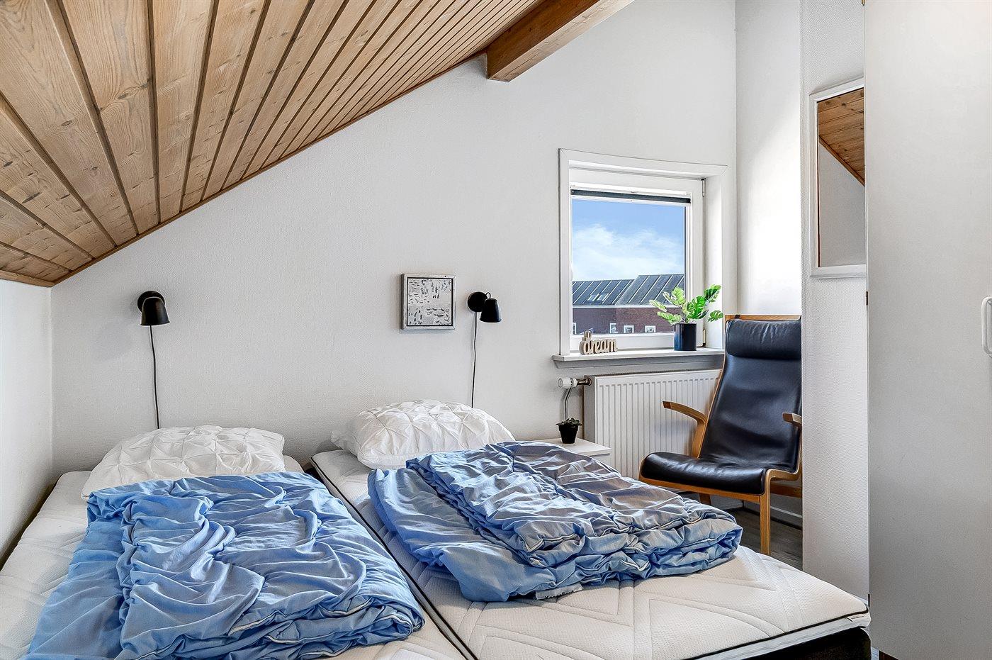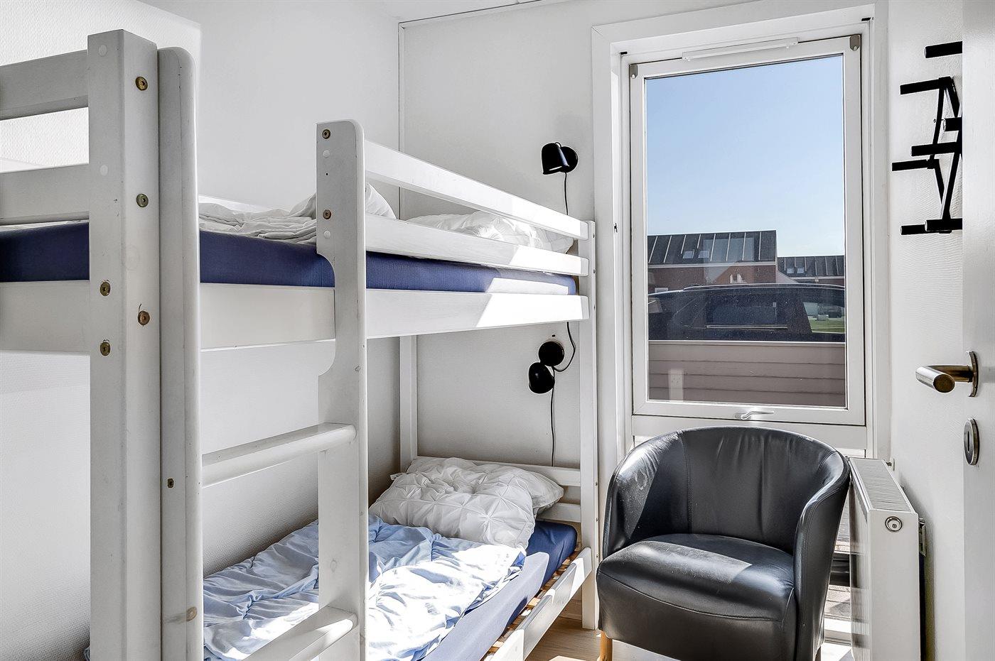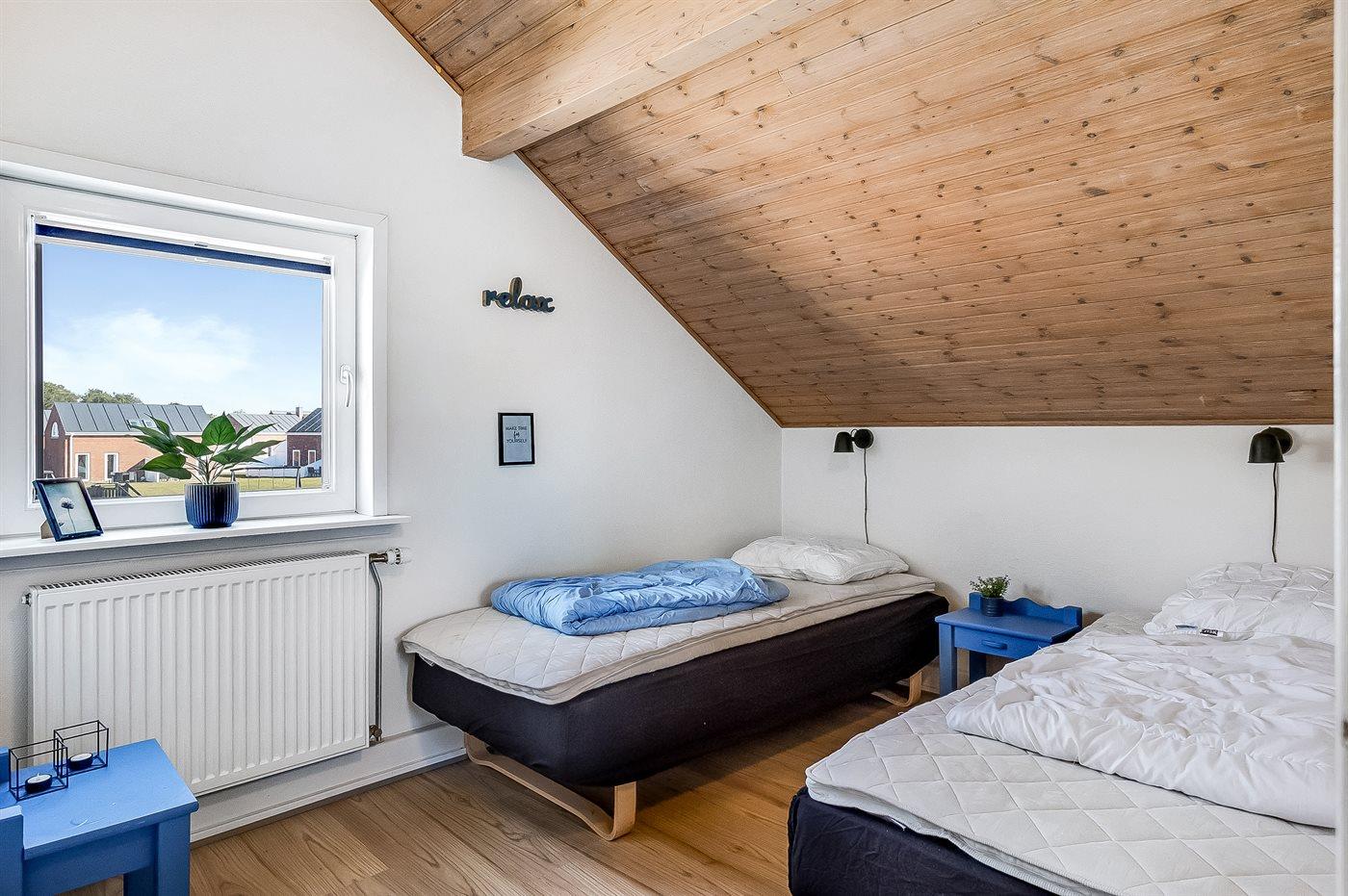 Der er i alt 3 soveværelser. Sovepladserne fordeler sig på: 2 sovepladser i dobbeltseng. 2 sovepladser i enkeltsenge. 2 sovepladser i køjeseng. Derudover er der 1 stk. barneseng.