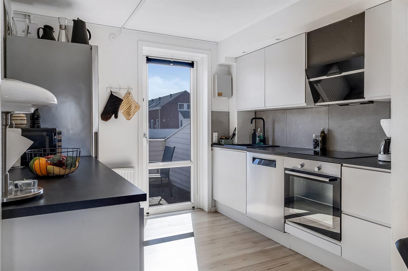 Køkkenet er udstyret med 1 køleskab. Der er 4 keramiske kogeplader, varmluftovn, mikrobølgeovn samt opvaskemaskine.