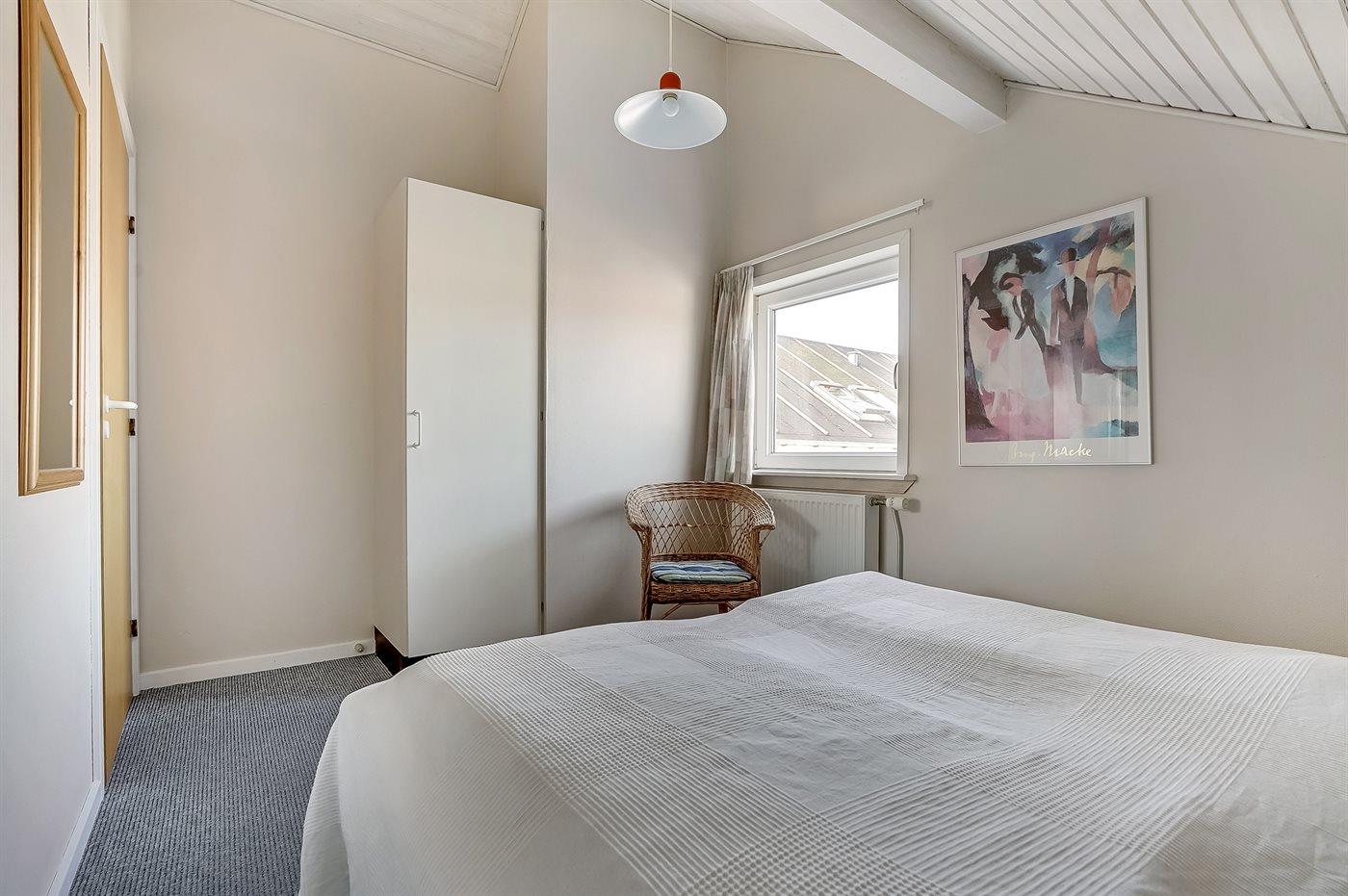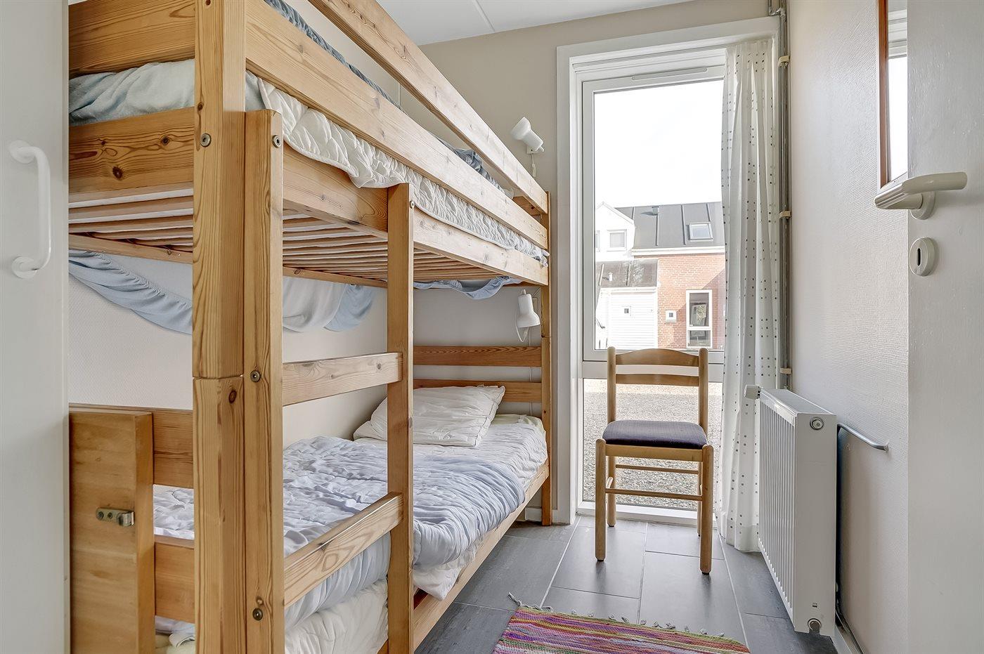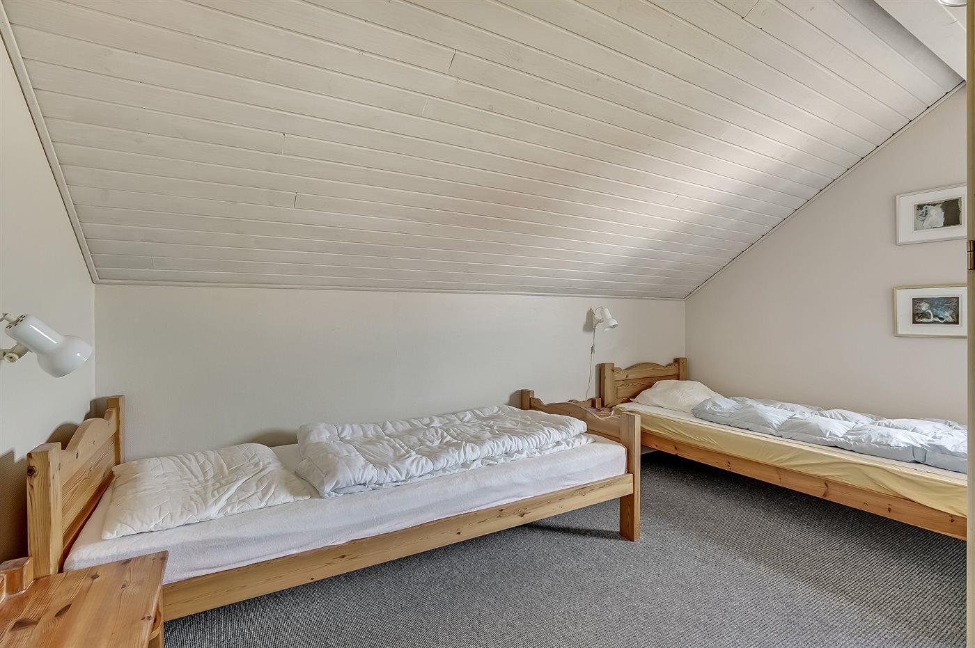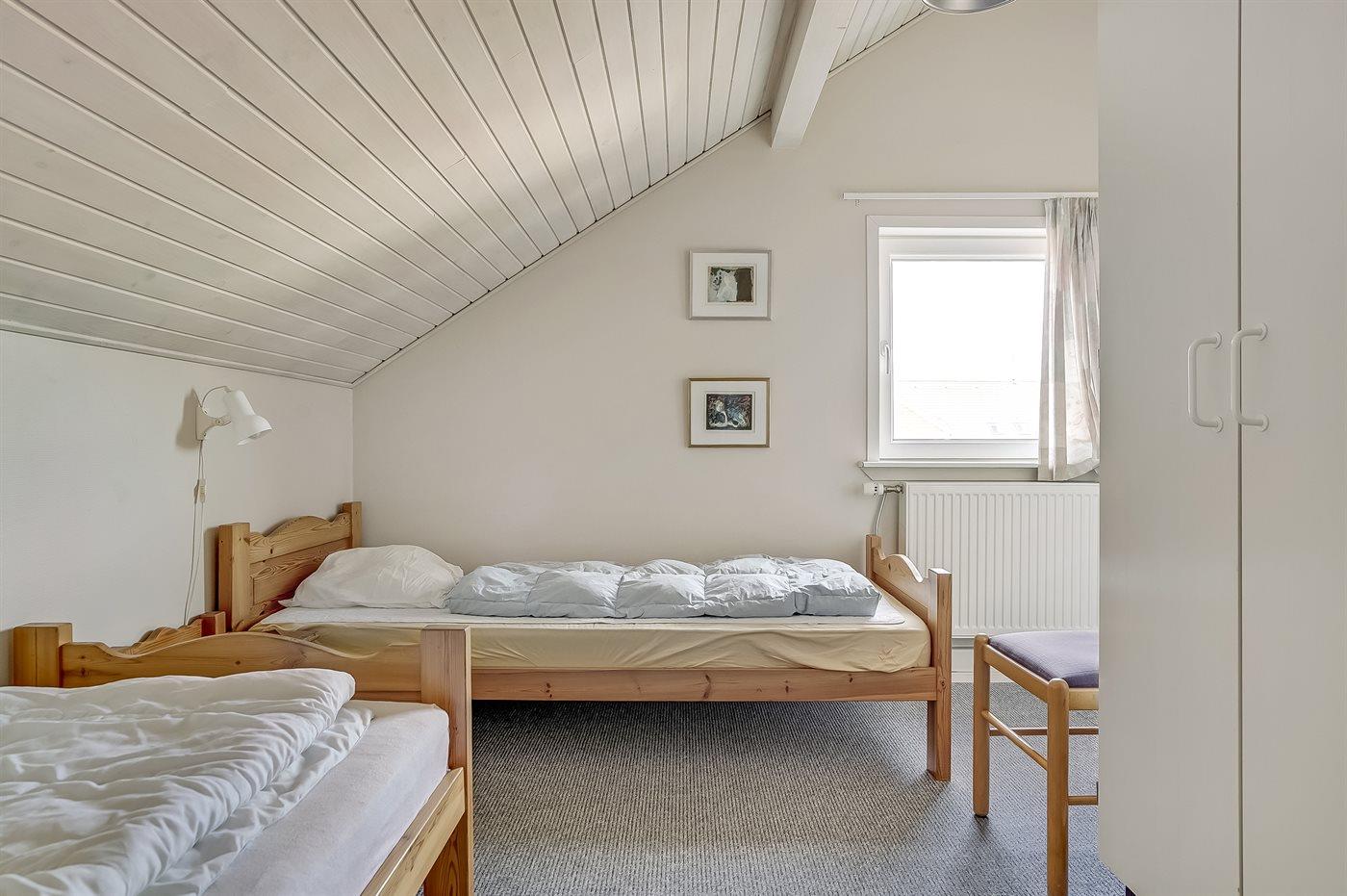 Der er i alt 3 soveværelser. Sovepladserne fordeler sig på: 2 sovepladser i dobbeltseng. 2 sovepladser i enkeltsenge. 2 sovepladser i køjeseng. Derudover er der 1 stk. barneseng.