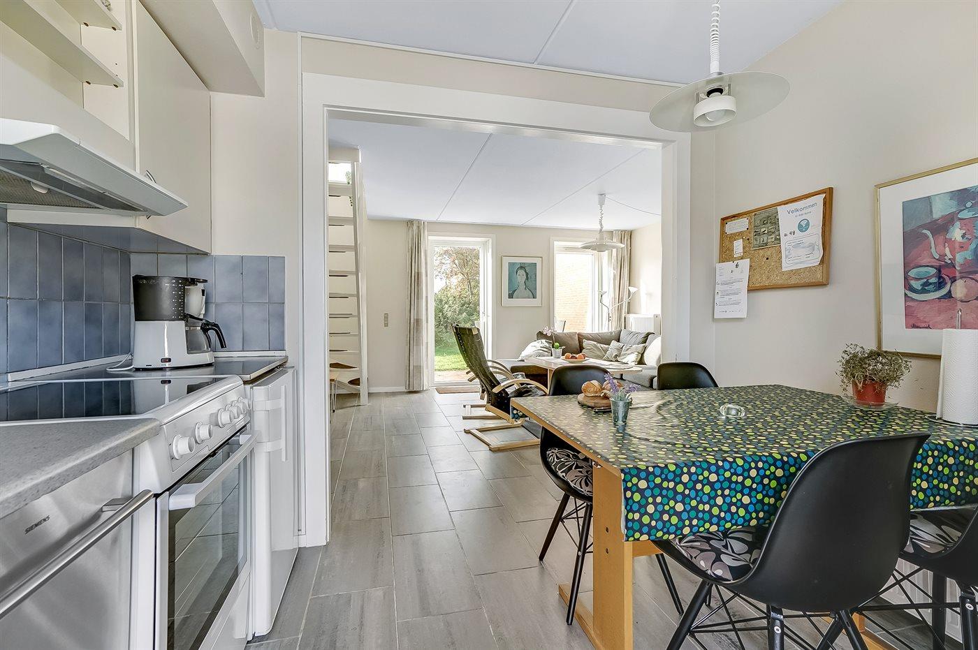 Køkkenet er udstyret med 1 køleskab. Der er 4 keramiske kogeplader, varmluftovn, mikrobølgeovn samt opvaskemaskine.