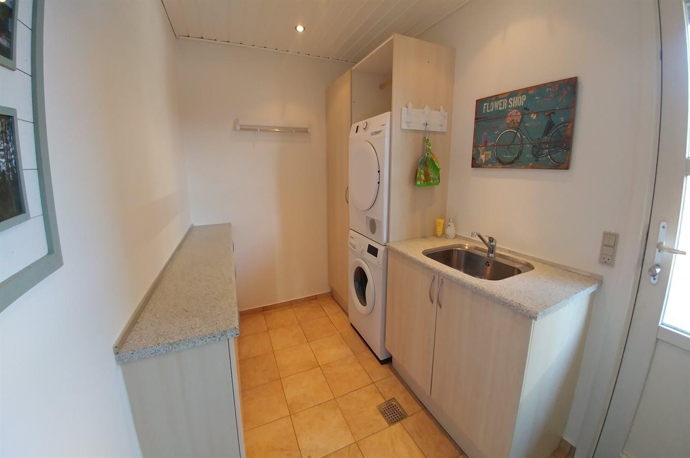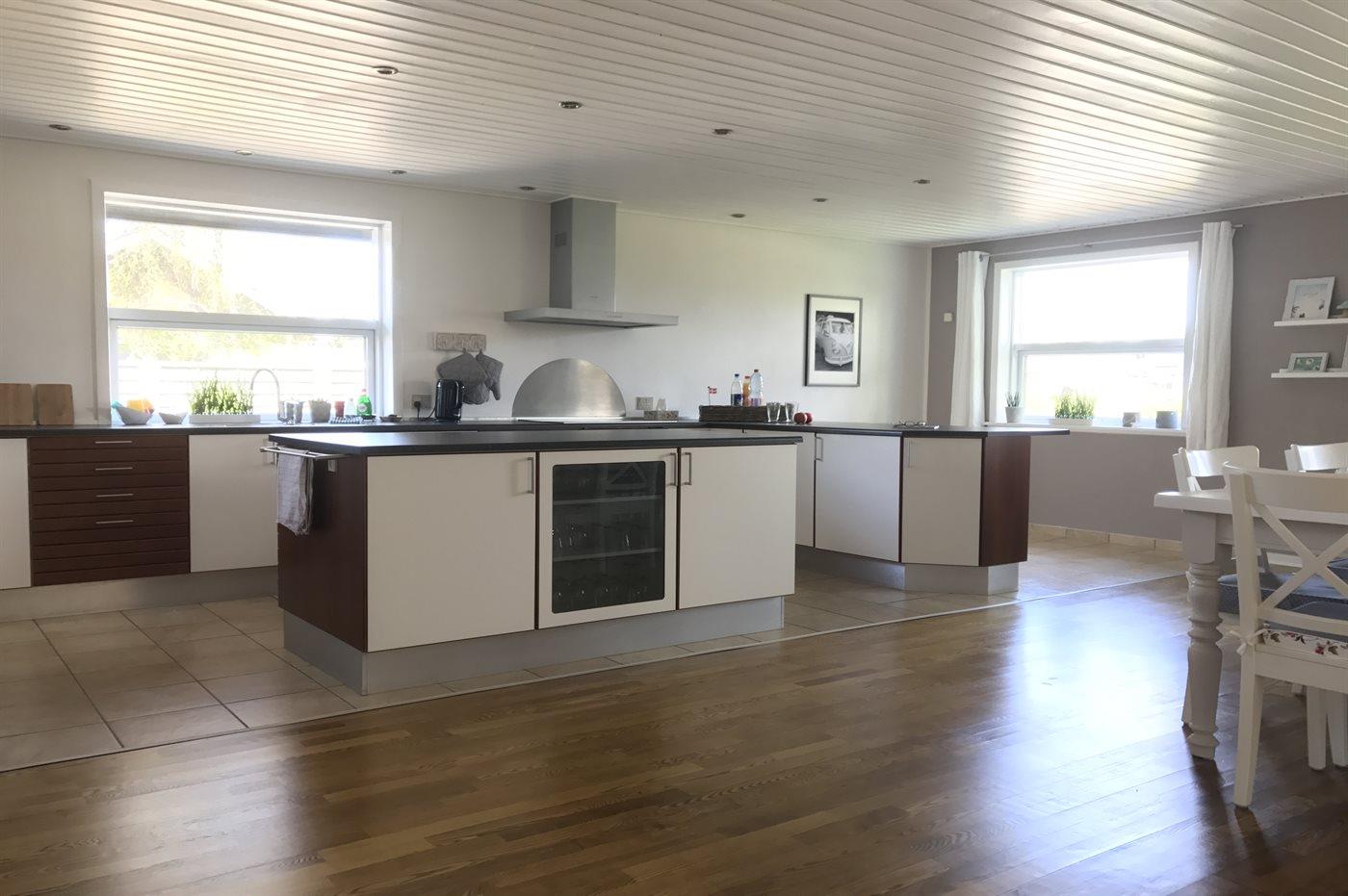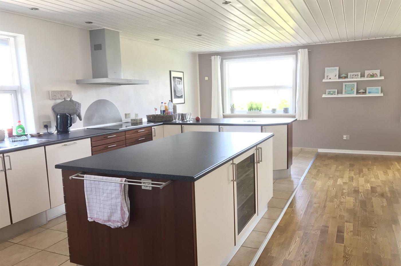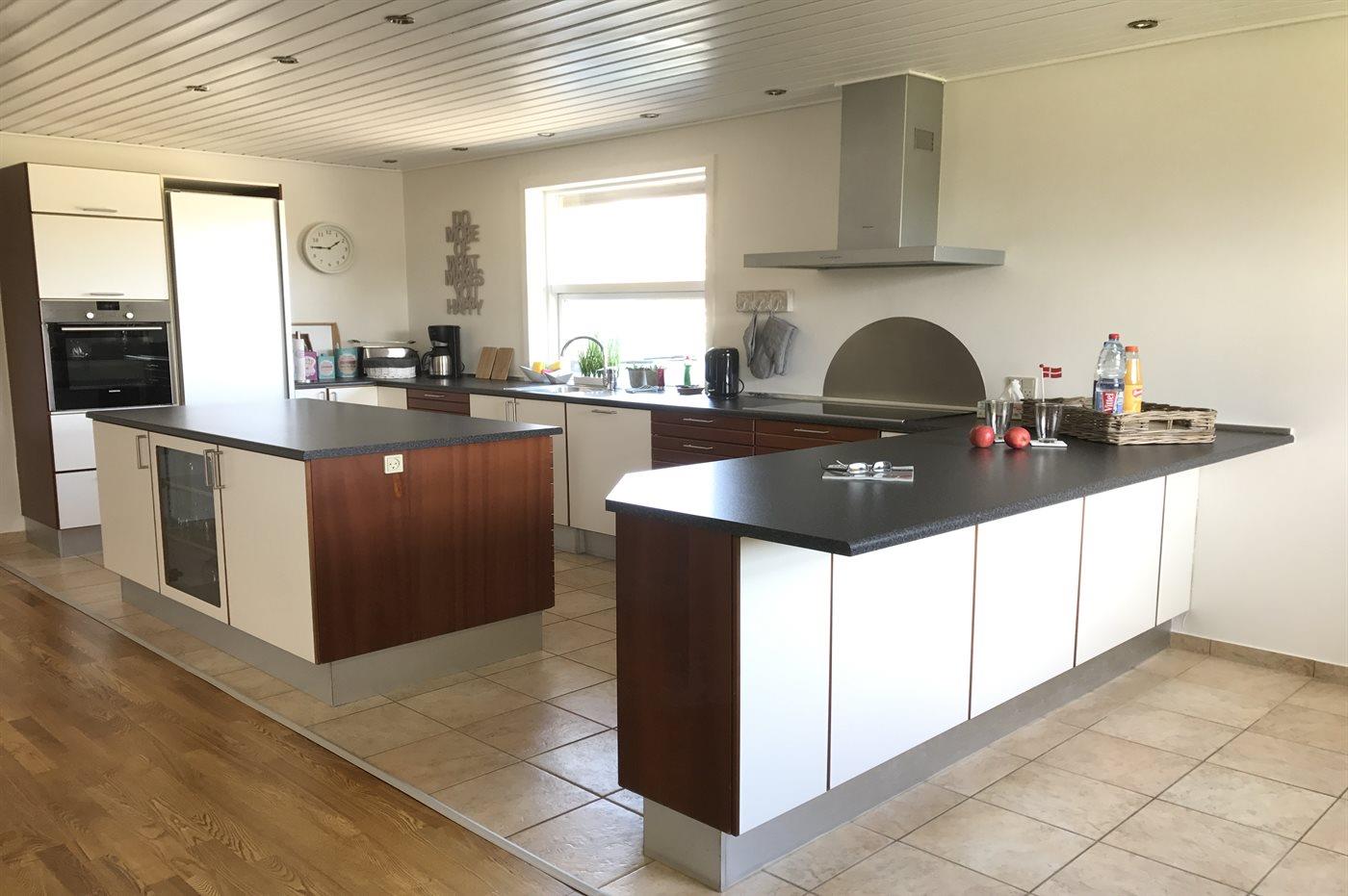 Køkkenet er udstyret med 1 køleskab. Der er 4 keramiske kogeplader, varmluftovn, mikrobølgeovn samt opvaskemaskine.
