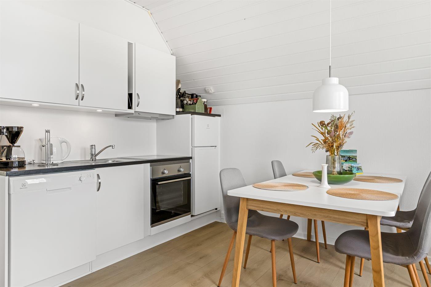 Køkkenet er udstyret med 1 køleskab. Der er 4 keramiske kogeplader, varmluftovn samt opvaskemaskine.