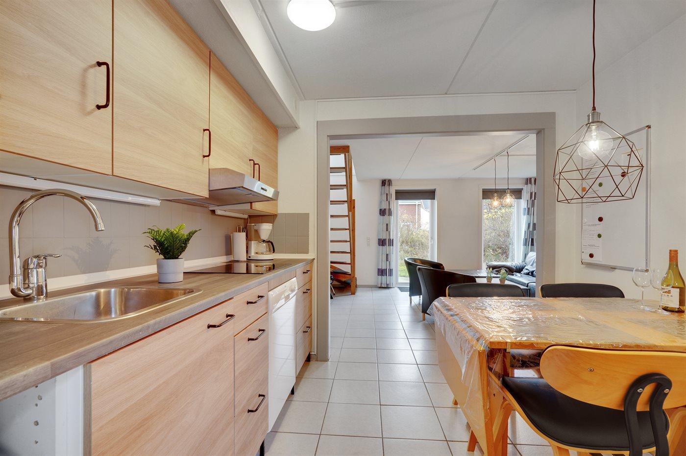 Køkkenet er udstyret med 1 køleskab. Der er 4 keramiske kogeplader, varmluftovn, kombineret miniovn og mikrobølgeovn samt opvaskemaskine.