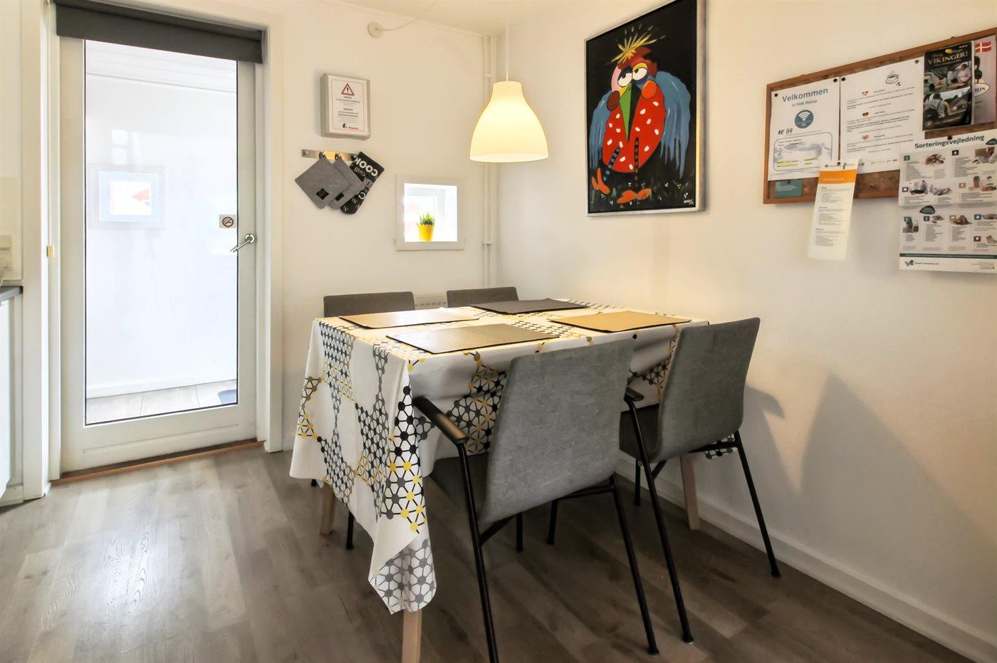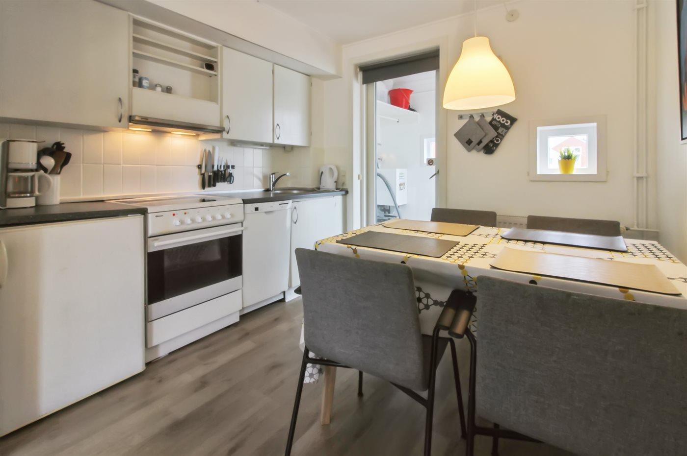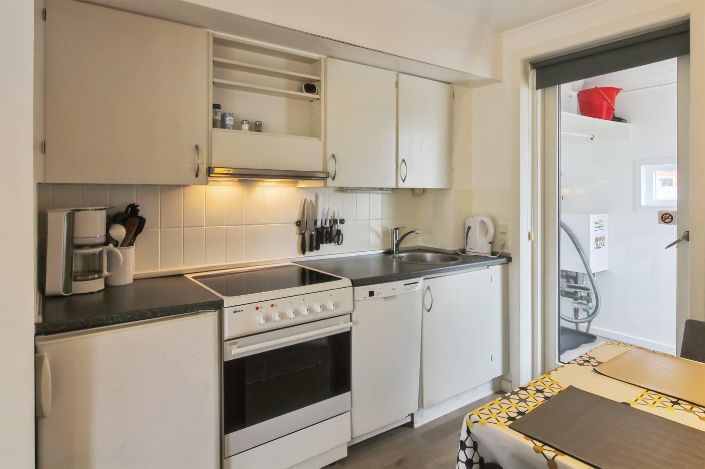 Køkkenet er udstyret med 1 køleskab. Der er 4 elkogeplader, bageovn samt opvaskemaskine.