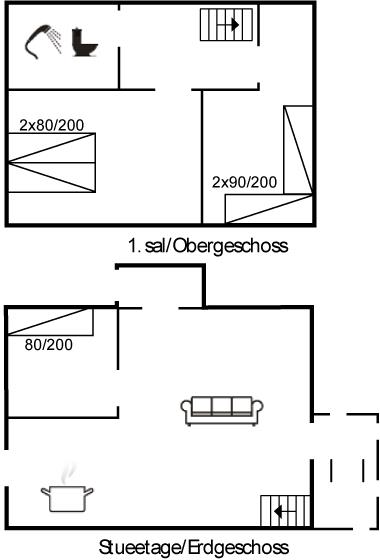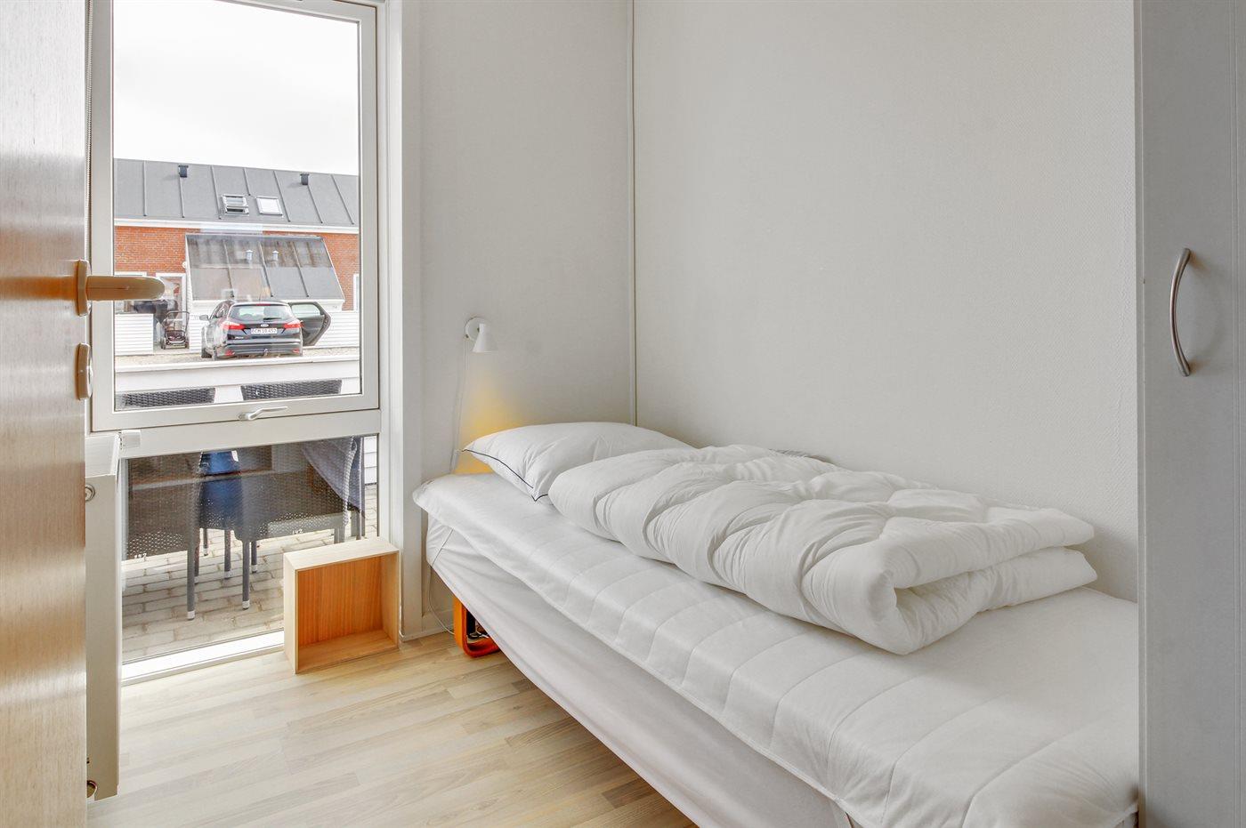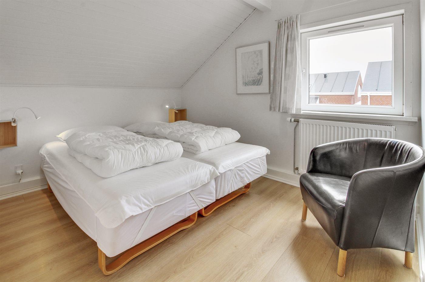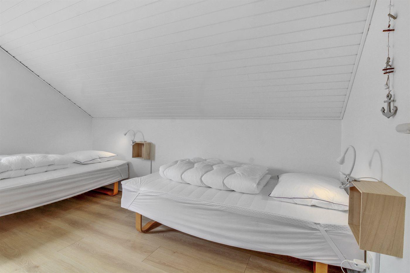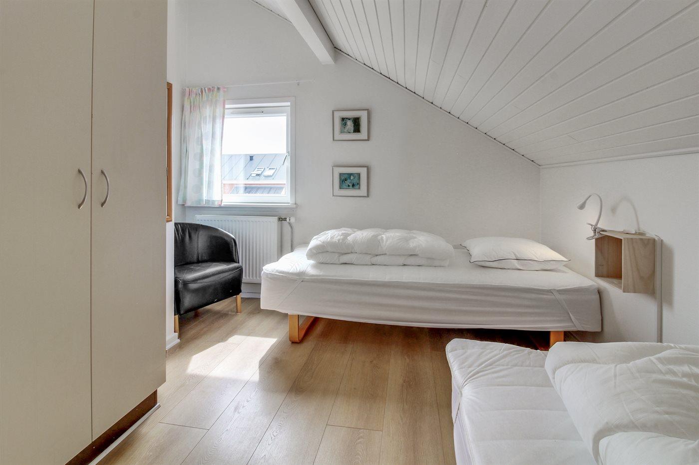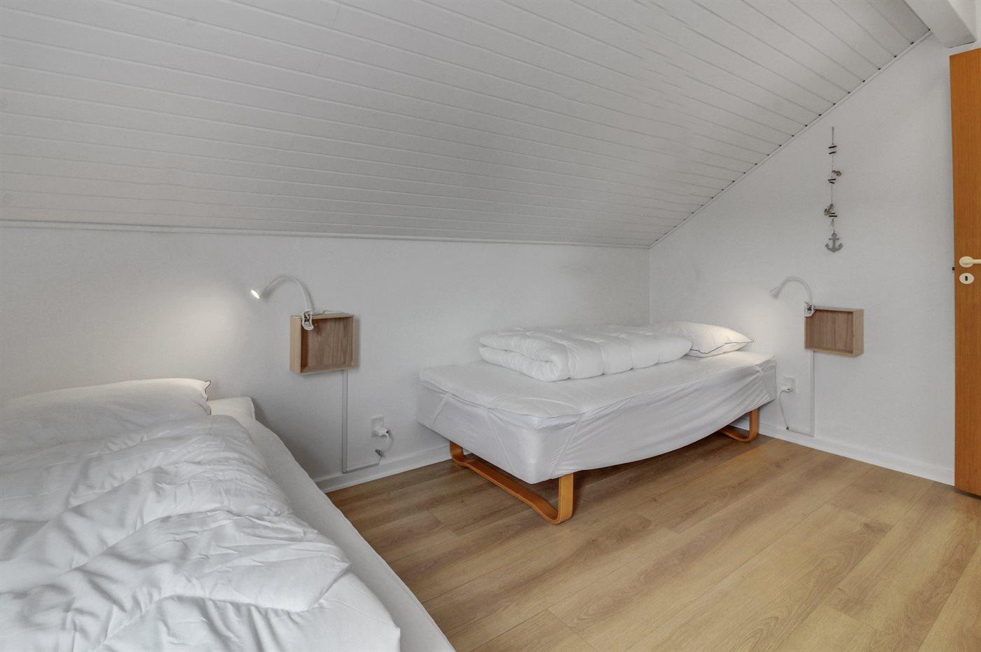 Der er i alt 3 soveværelser. Sovepladserne fordeler sig på: 2 sovepladser i dobbeltseng. 3 sovepladser i enkeltsenge.