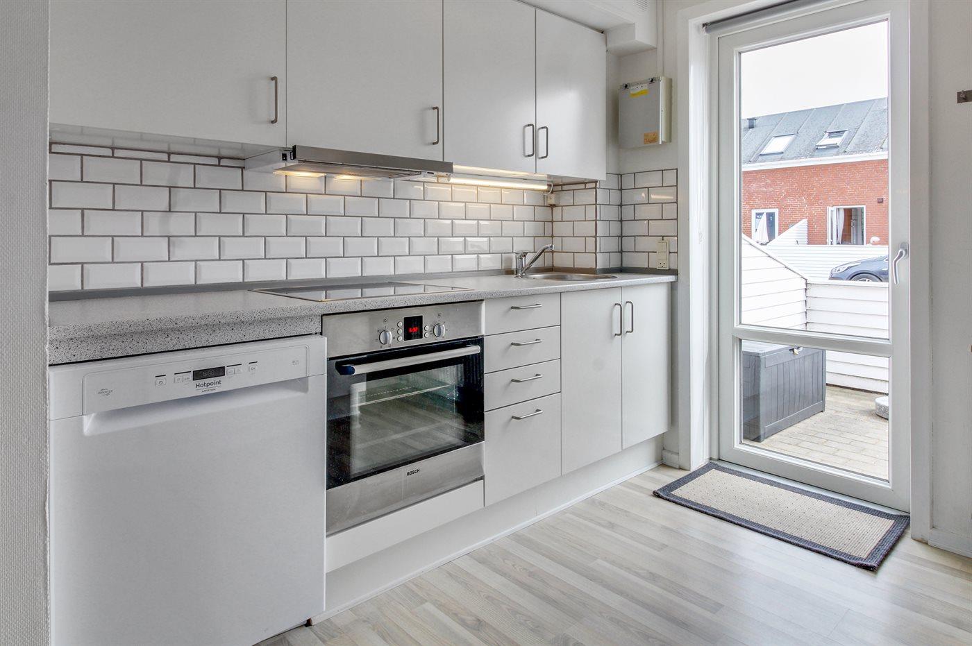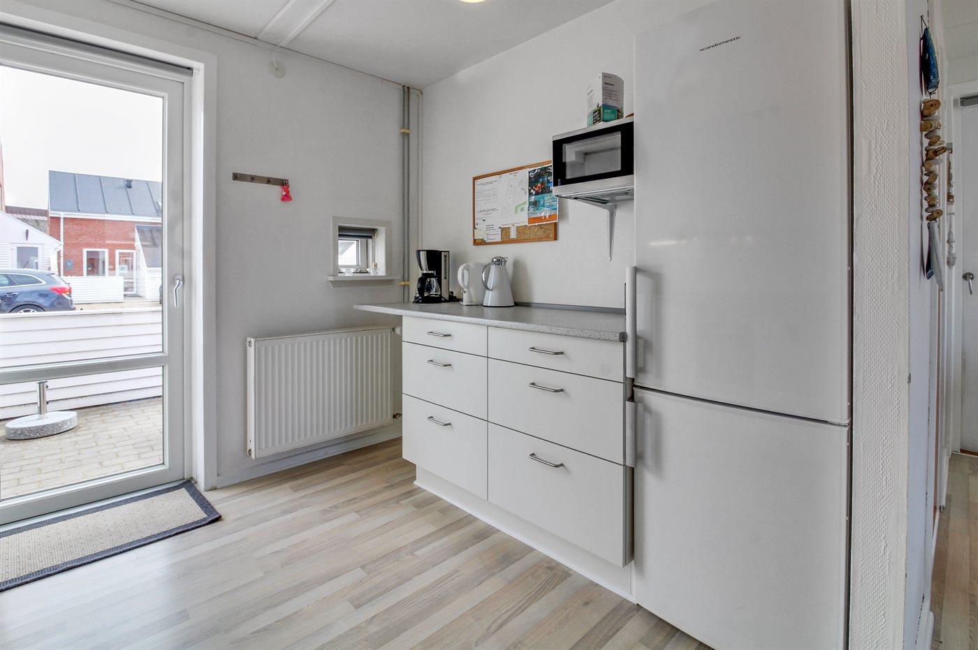 Køkkenet er udstyret med 1 køleskab. Der er 4 elkogeplader, bageovn, mikrobølgeovn samt opvaskemaskine.