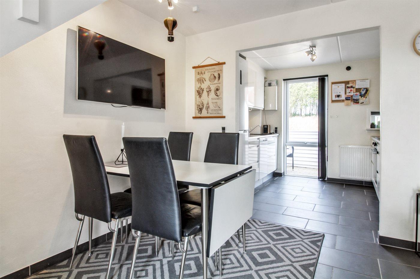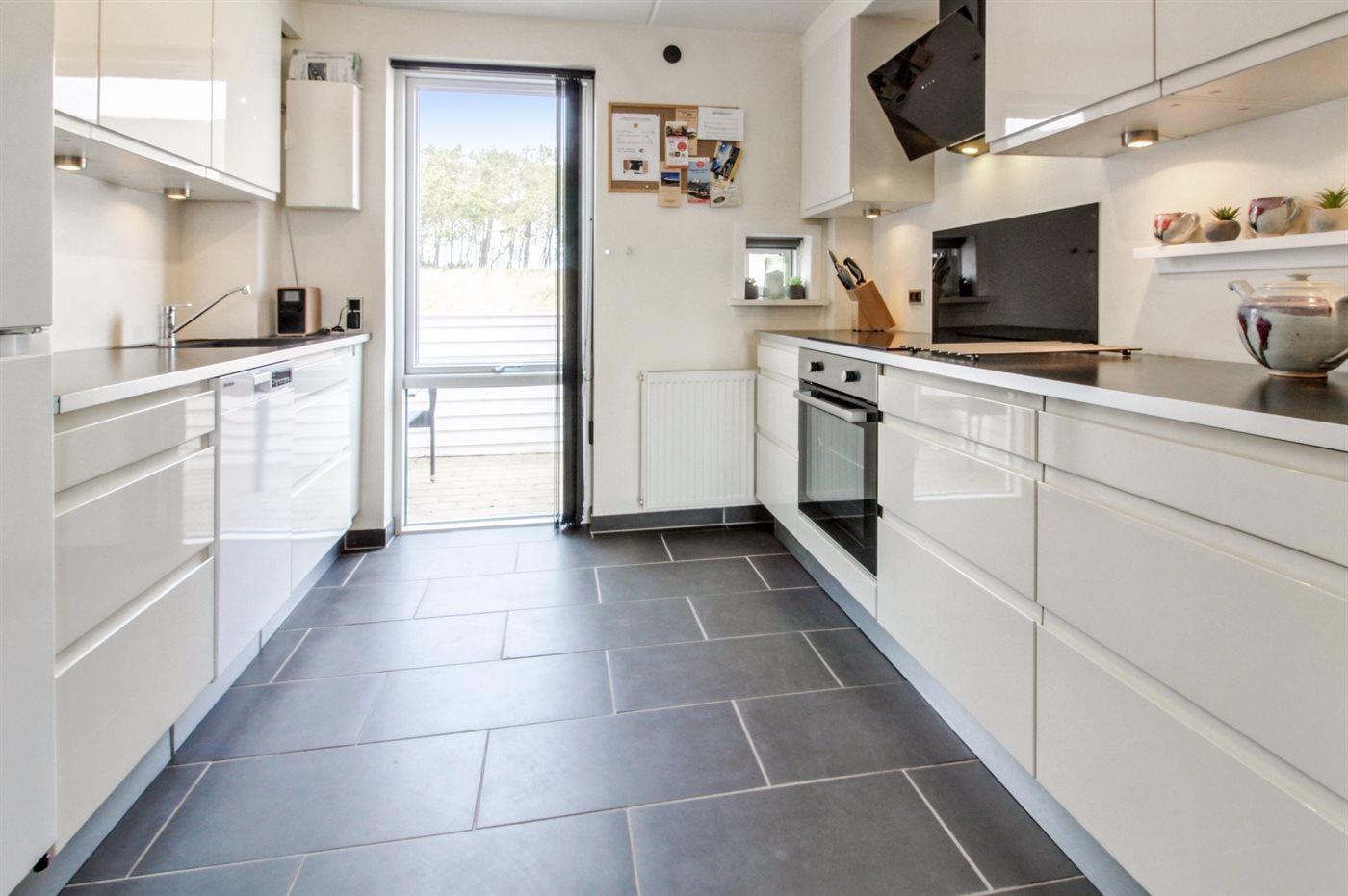 Køkkenet er udstyret med 1 køleskab. Der er 4 elkogeplader, varmluftovn, mikrobølgeovn samt opvaskemaskine Der er gulvvarme i køkkenet.