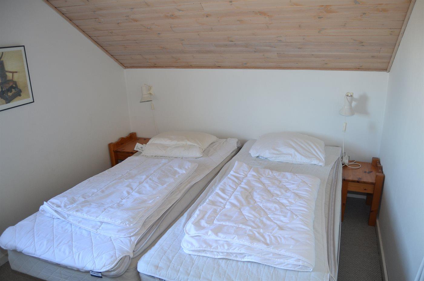 Der er i alt 3 soveværelser. Sovepladserne fordeler sig på: 2 sovepladser i dobbeltseng. 2 sovepladser i enkeltsenge. 2 sovepladser i køjeseng. Derudover er der 1 stk. barneseng.