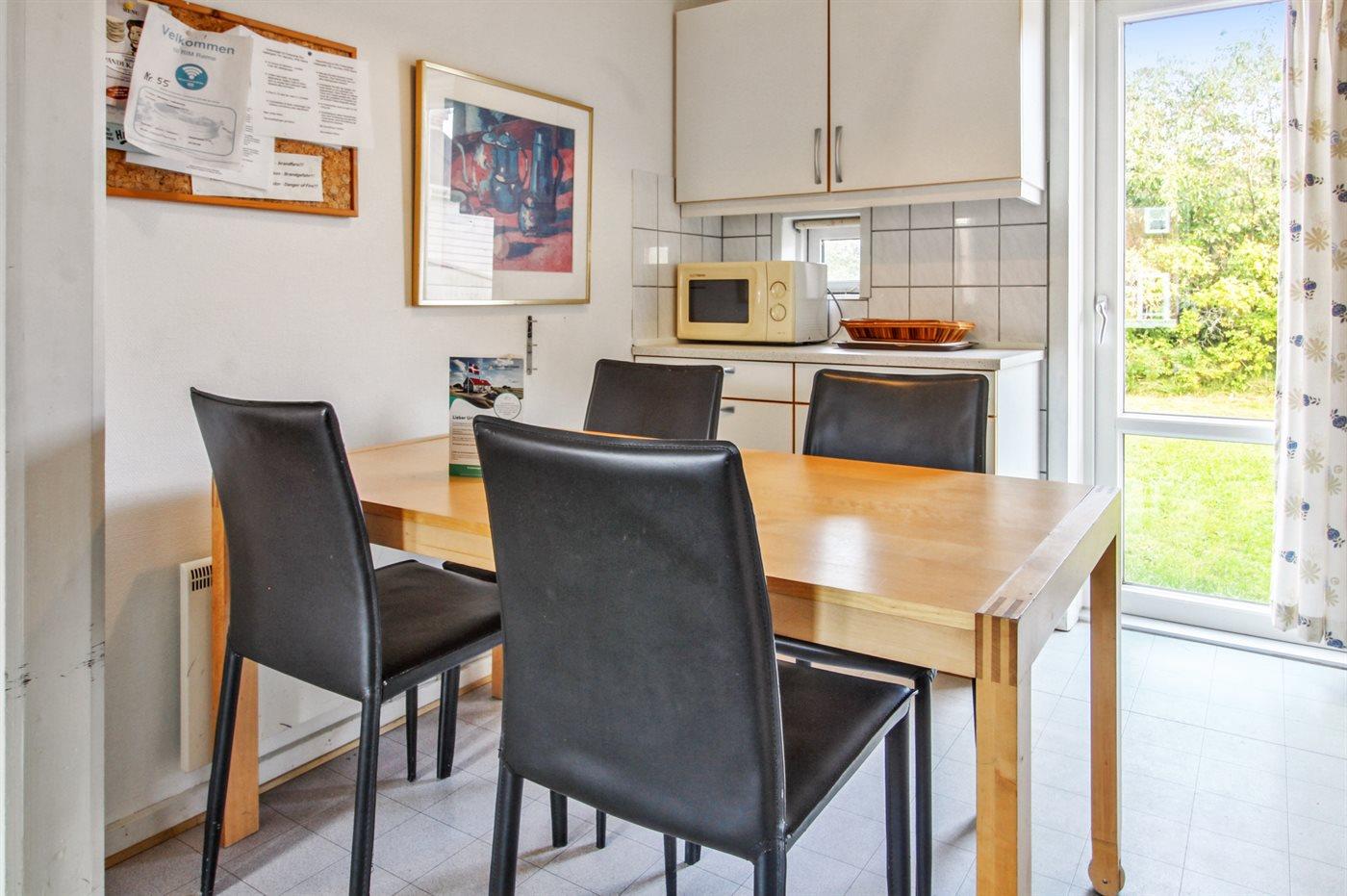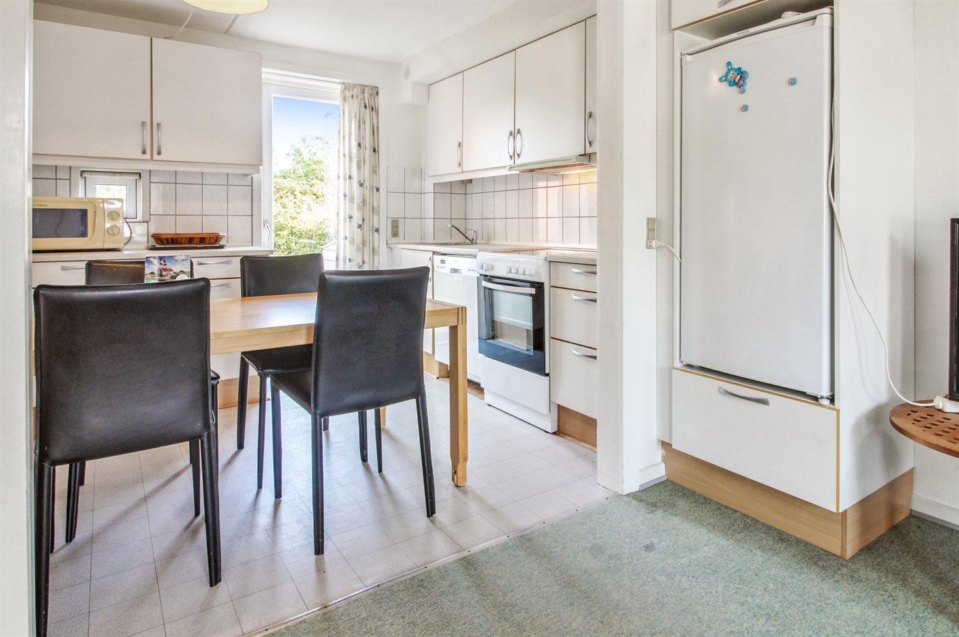 Køkkenet er udstyret med 1 køleskab. Der er 4 keramiske kogeplader, varmluftovn samt opvaskemaskine.