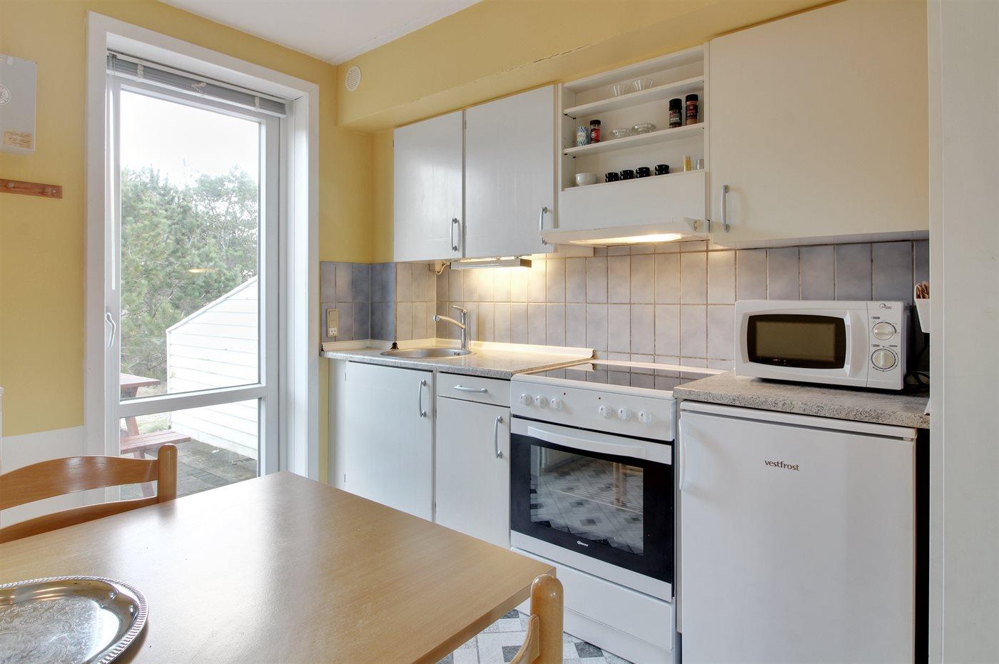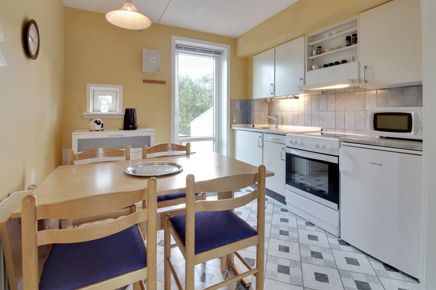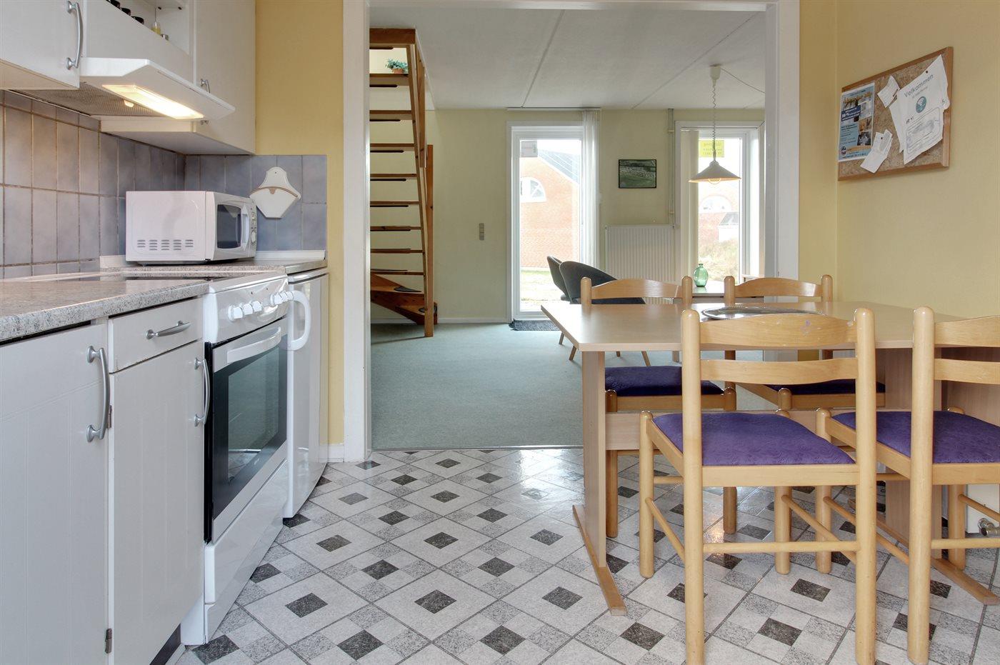 Køkkenet er udstyret med 1 køleskab. Der er 4 elkogeplader, bageovn, mikrobølgeovn.