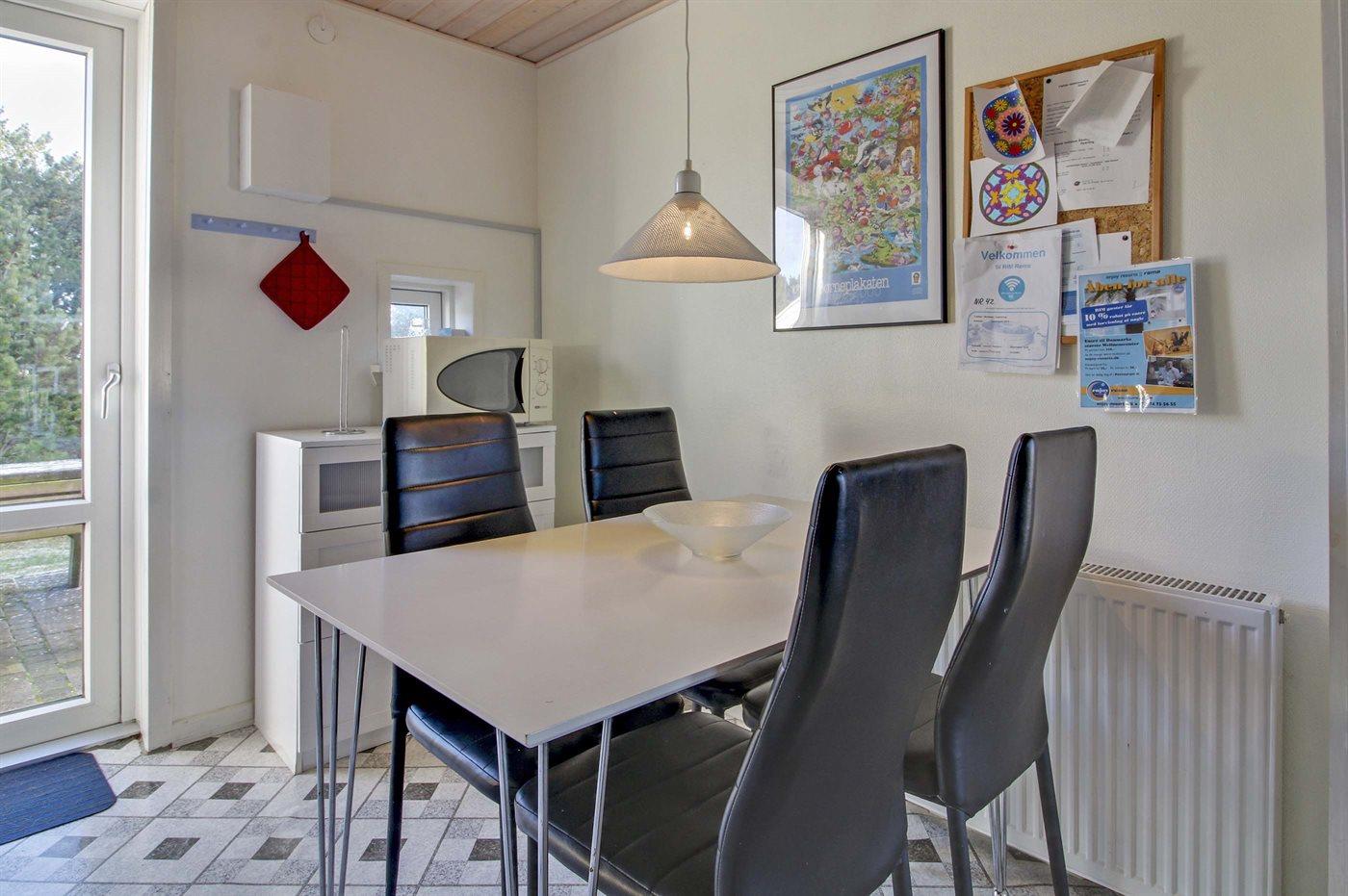 Køkkenet er udstyret med 1 køleskab. Der er 4 elkogeplader, bageovn, mikrobølgeovn.