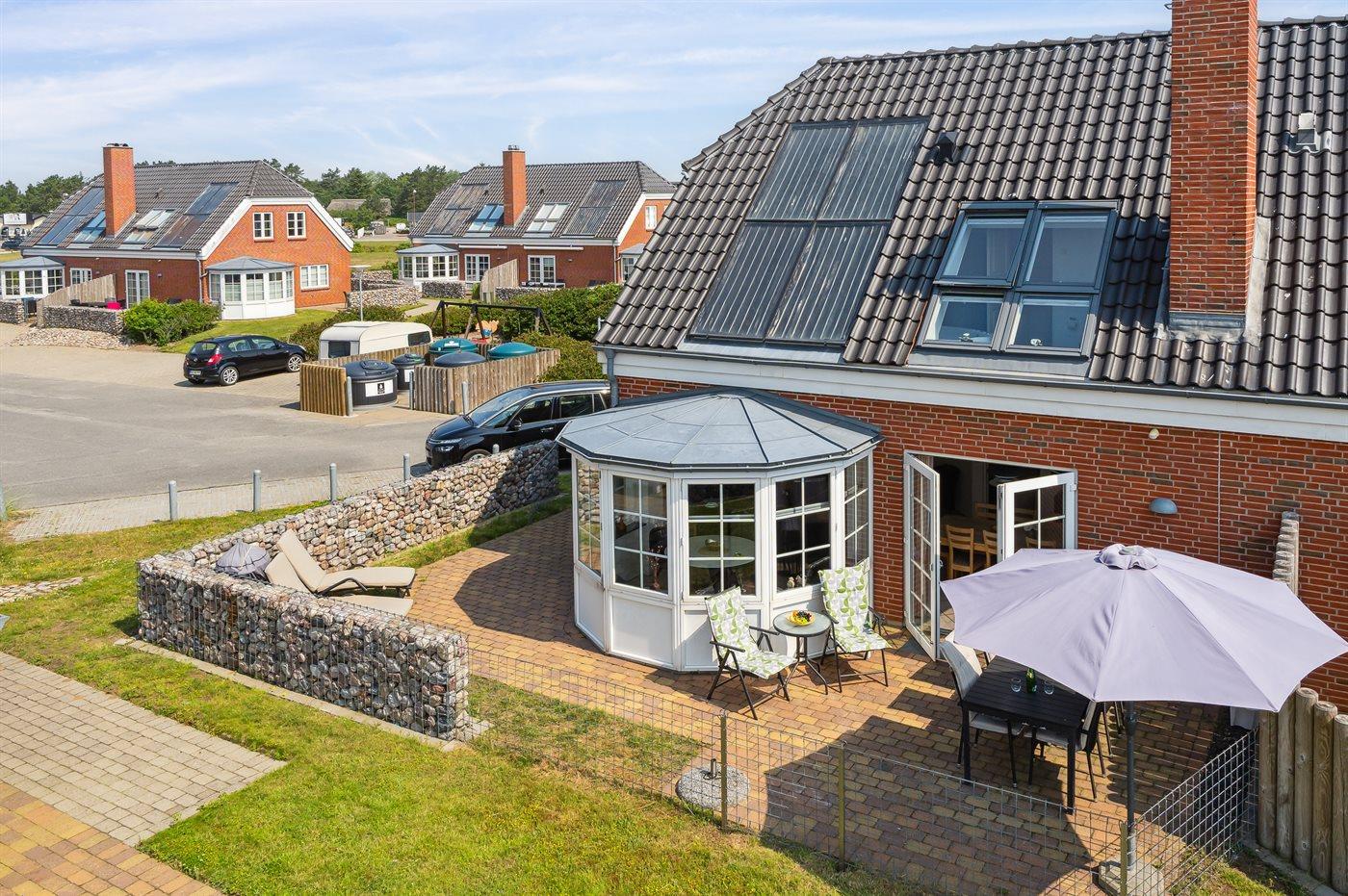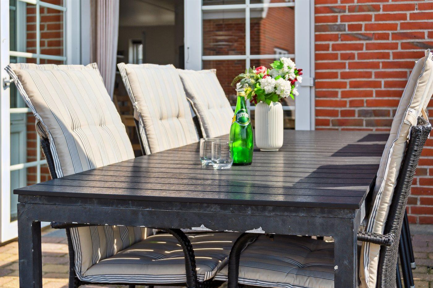 Der er 3 terrasser (øst, nord og syd/vest) ved huset. De to af terrasserne er indhegnet, så hunden kan løbe frit. Der er havebord og stole til 6 personer. Herudover er der 2 drømmesenge. Der er hynder til alle havemøbler. Der er også grill til rådighed for gæsterne.