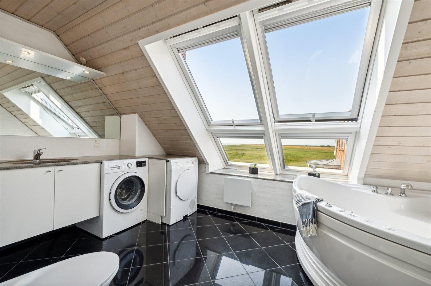 På førstesalen er huset udstyret med yderligere et badeværelse med toilet, bruser og spabad til 2 personer. I badeværelset er der gulvvarme. Fra badeværelset er der en fantastisk udsigt over Vadehavet.