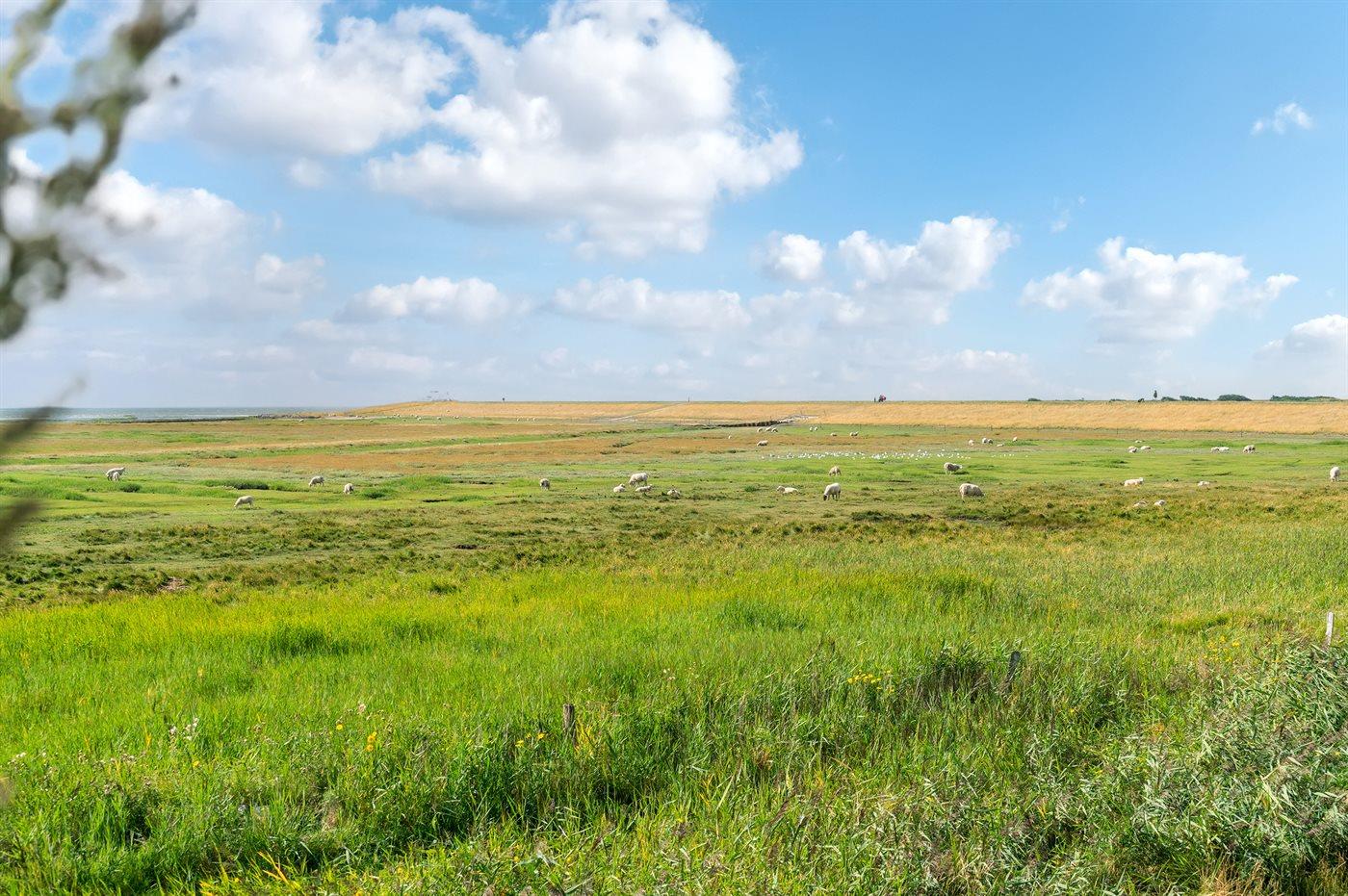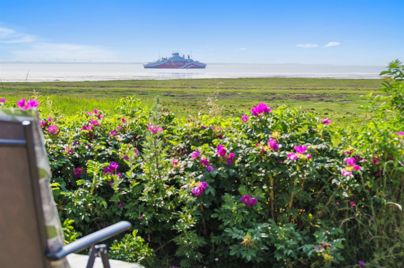 Der er en unik udsigt over Vadehavet fra såvel hus som grund. På græsarealet mellem huset og Vadehavet er der hele sommeren udsigt til fårehold med lam.