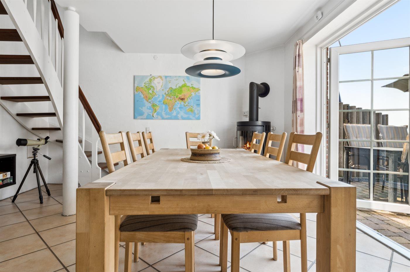 Huset er indrettet med et opholdsrum i stueetagen, som indeholder både køkken og stue, her er også en karnap med fantastisk udsigt over Vadehavet. Herudover er der en entre med god garderobeplads, samt et badeværelse med toilet, bruser og sauna med dampterapi. Der er gulvvarme i hele stueetagen og brændeovn i stuen.