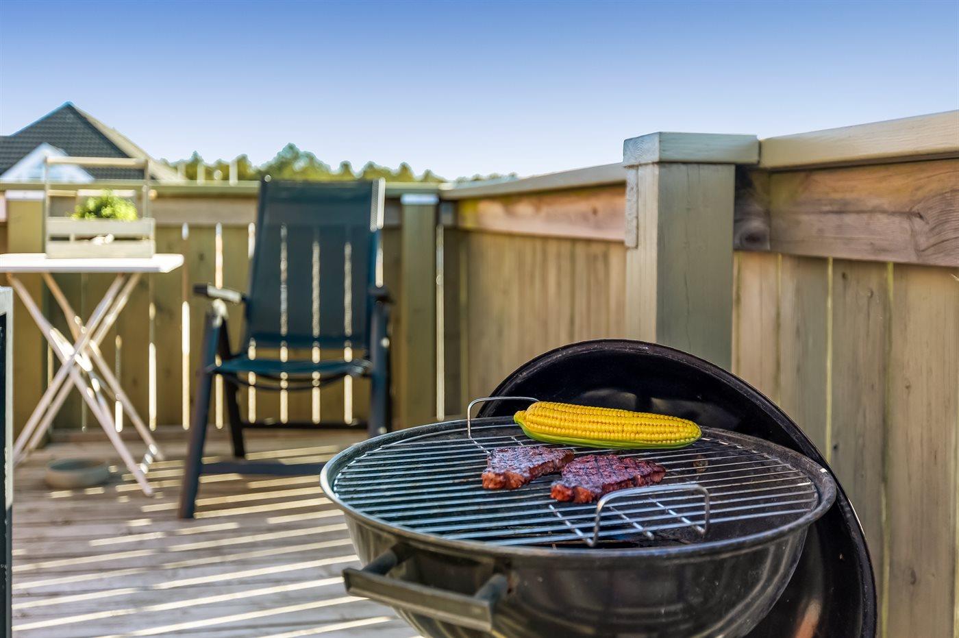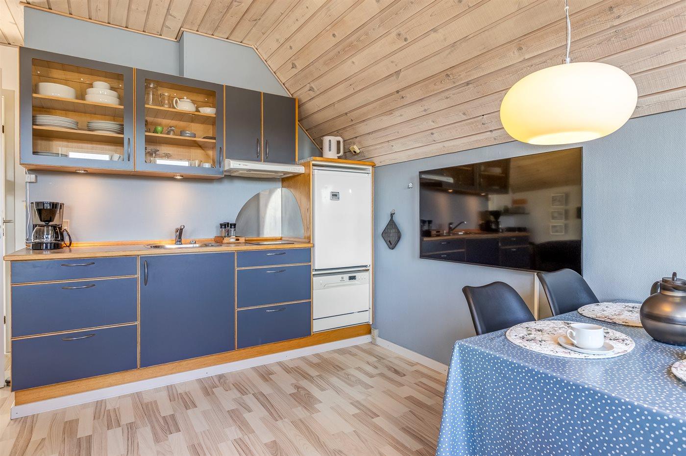 Køkkenet er udstyret med 1 køleskab. Der er 2 keramiske kogeplader, miniovn, mikrobølgeovn samt opvaskemaskine (bordmodel).