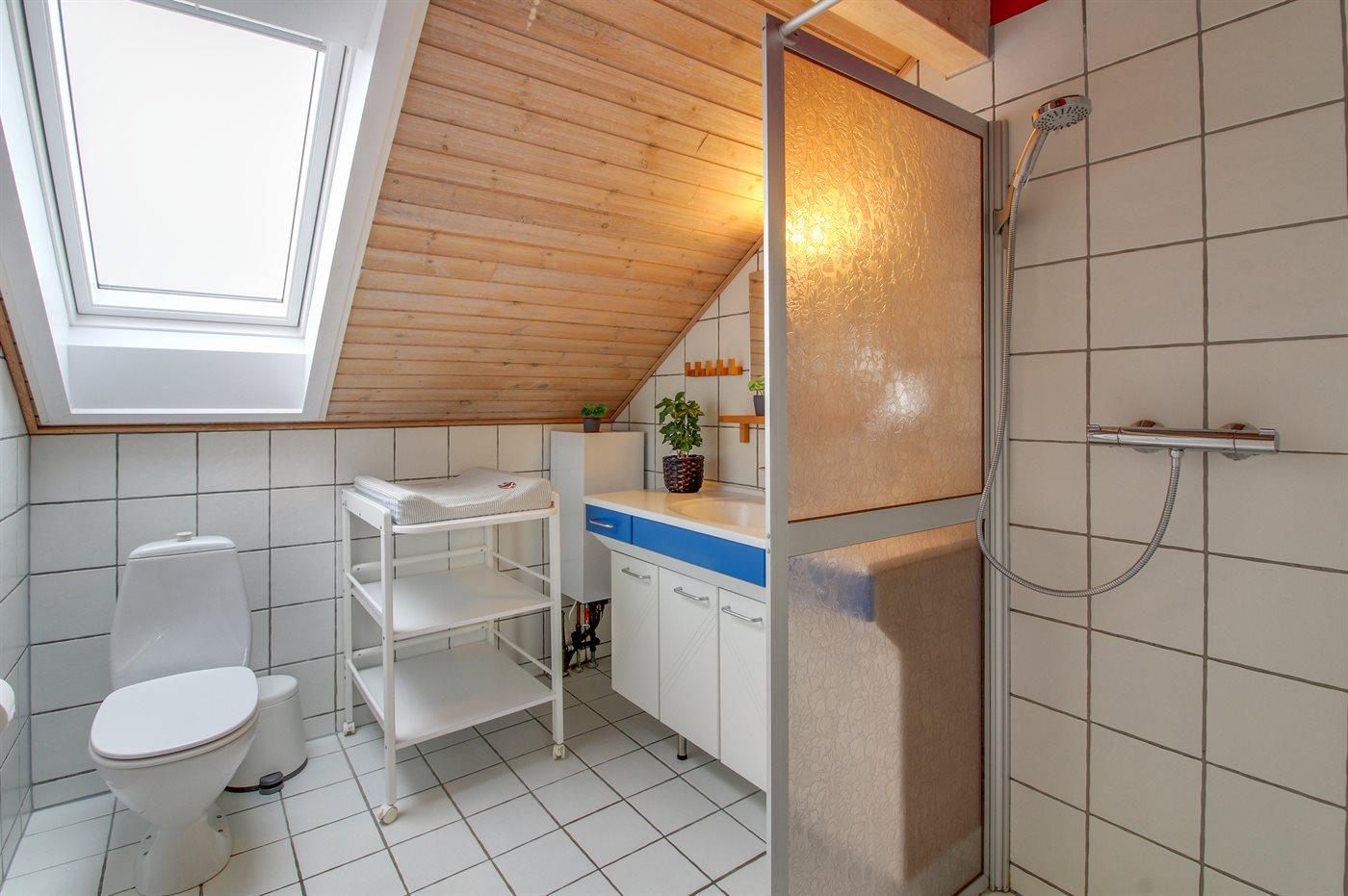 Der er 1 badeværelse med bruseniche og 1 toilet samt et puslebord til familiens mindste.