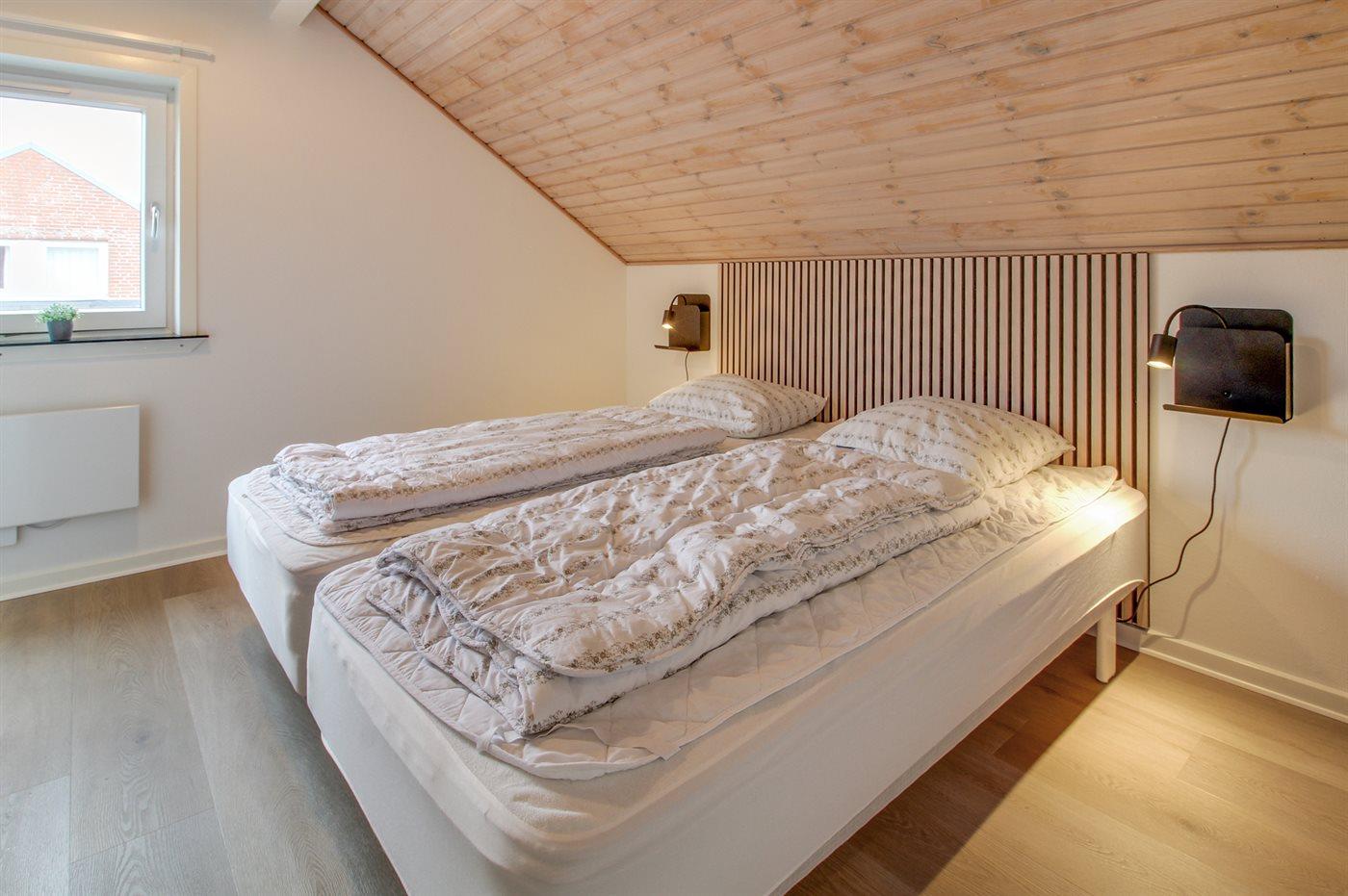 Der er i alt 3 soveværelser. Sovepladserne fordeler sig på: 2 sovepladser i dobbeltseng. 2 sovepladser i enkeltsenge der kan skubbes sammen samt 1 soveplads i enkeltseng. Endvidere stilles der en barneseng til rådighed.