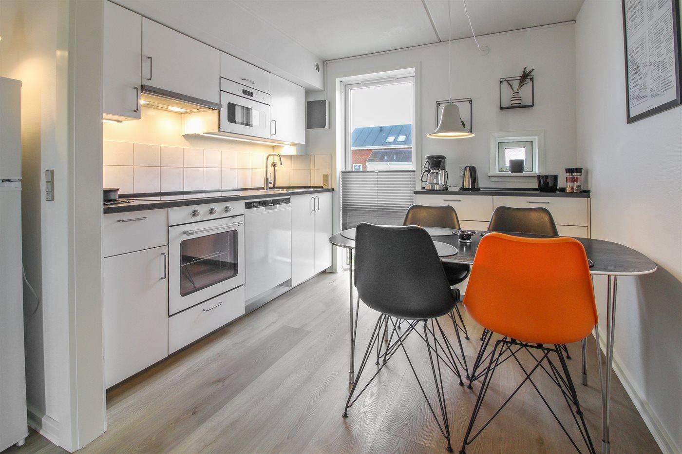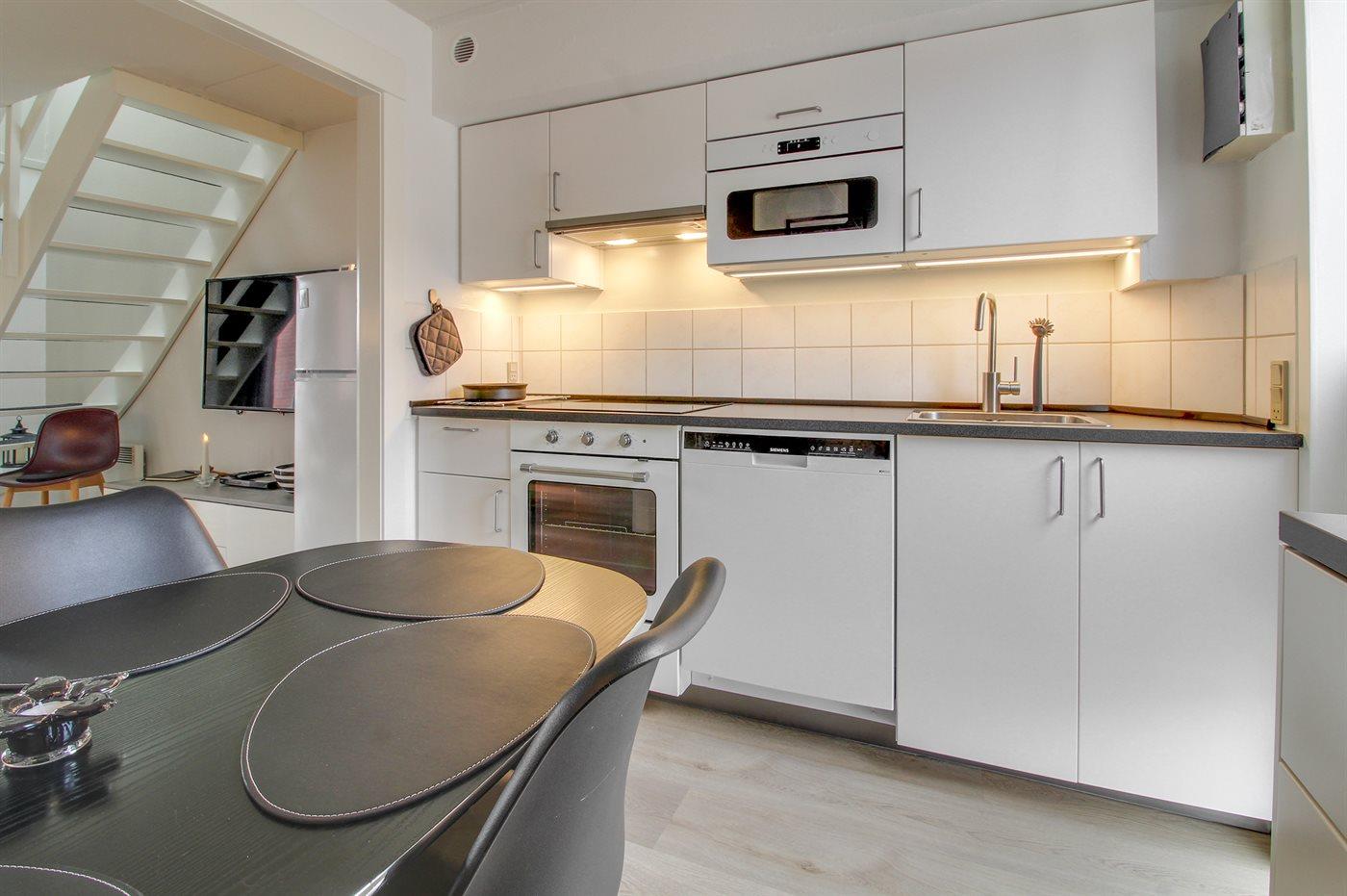 Det veludstyrede køkken råder over 1 køle/fryseskab. Frysekapacitet på 41 liter / kølekapacitet på 163 liter, 4 induktionskogeplader, varmluftovn, mikrobølgeovn samt opvaskemaskine. En høj stol og børneservice til de små.
