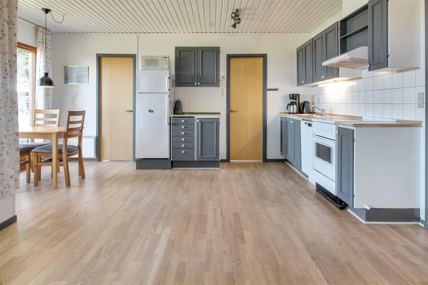 Køkkenet er udstyret med 1 køleskab. Der er 4 keramiske kogeplader, varmluftovn, mikrobølgeovn samt opvaskemaskine.