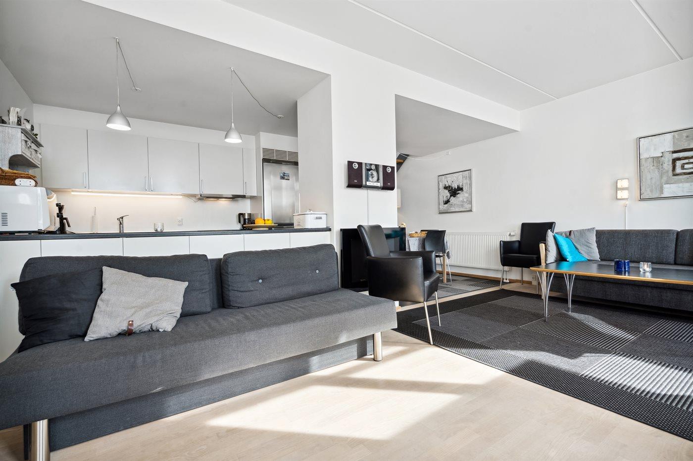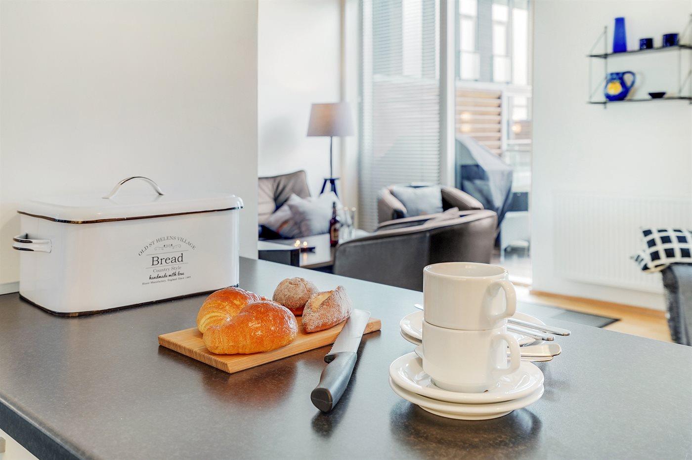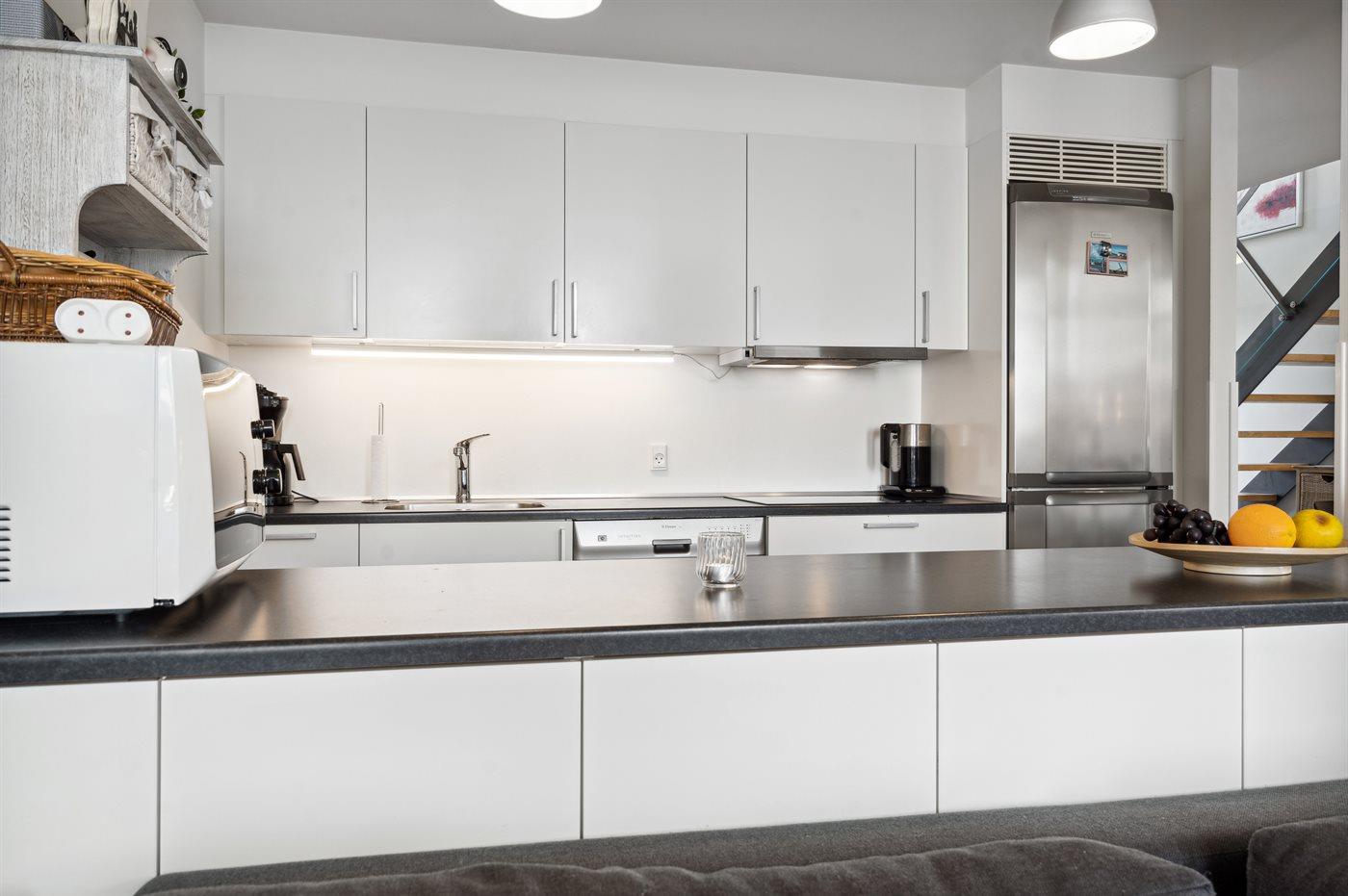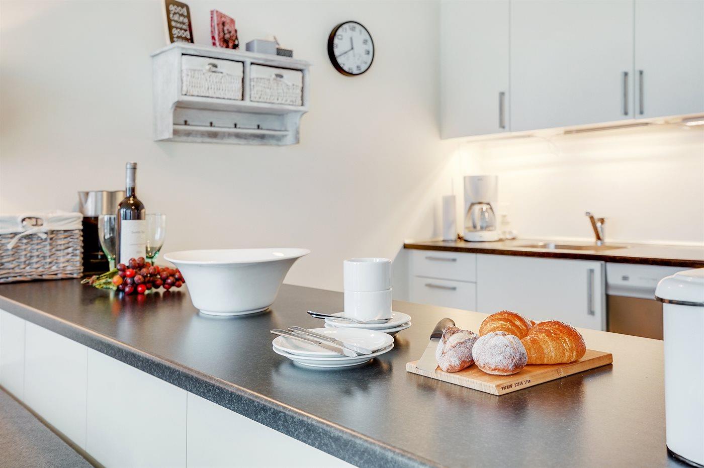 Køkkenet er udstyret med 1 køleskab. Der er 4 keramiske kogeplader, varmluftovn, mikrobølgeovn samt opvaskemaskine.