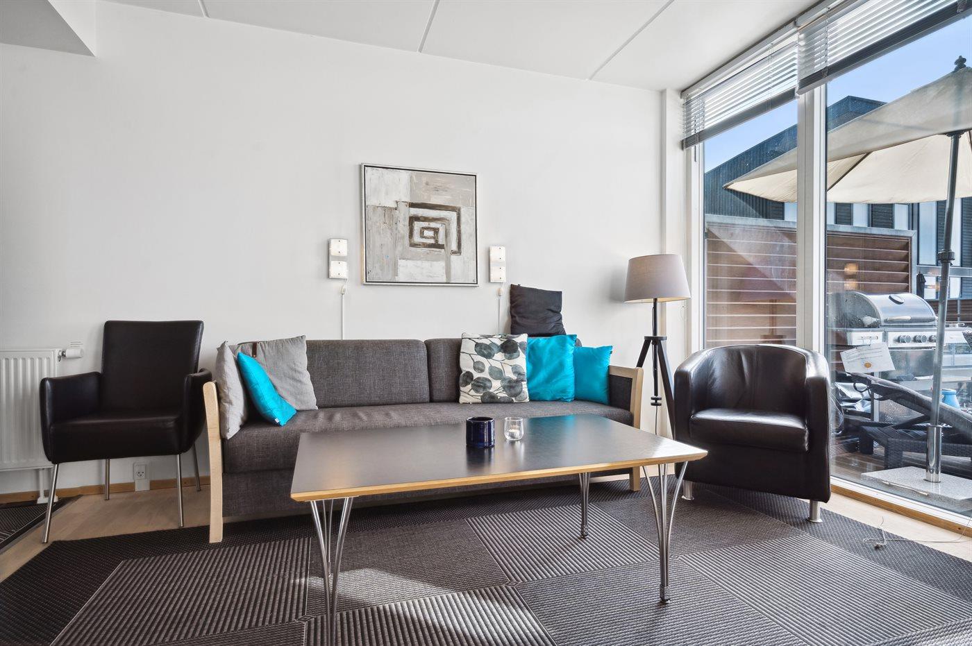 Ferielejligheden egner sig til 7 personer samt 1 barn op til 3 år. Ferieboligen er på 124 m², er i 2 plan, og er bygget i 2010. Det er tilladt at medbringe 2 husdyr. Der er gulvvarme i alle klinkegulve. Ferieboligen har vaskemaskine. Tørretumbler. Frysekapacitet på 50 liter. Der er desuden biopejs. Til de små er der 1 stk. barnestol.