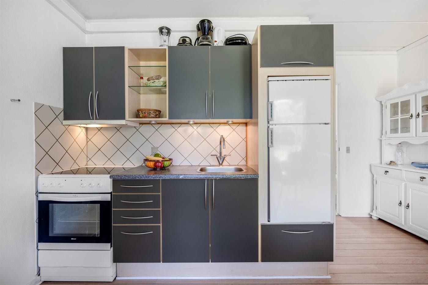 Køkkenet er udstyret med 1 køleskab. Der er 4 elkogeplader, bageovn. Der findes desuden ekstra køleskab/fryser i skuret.