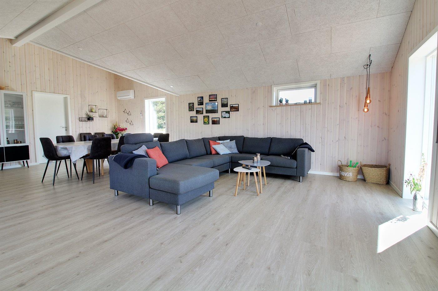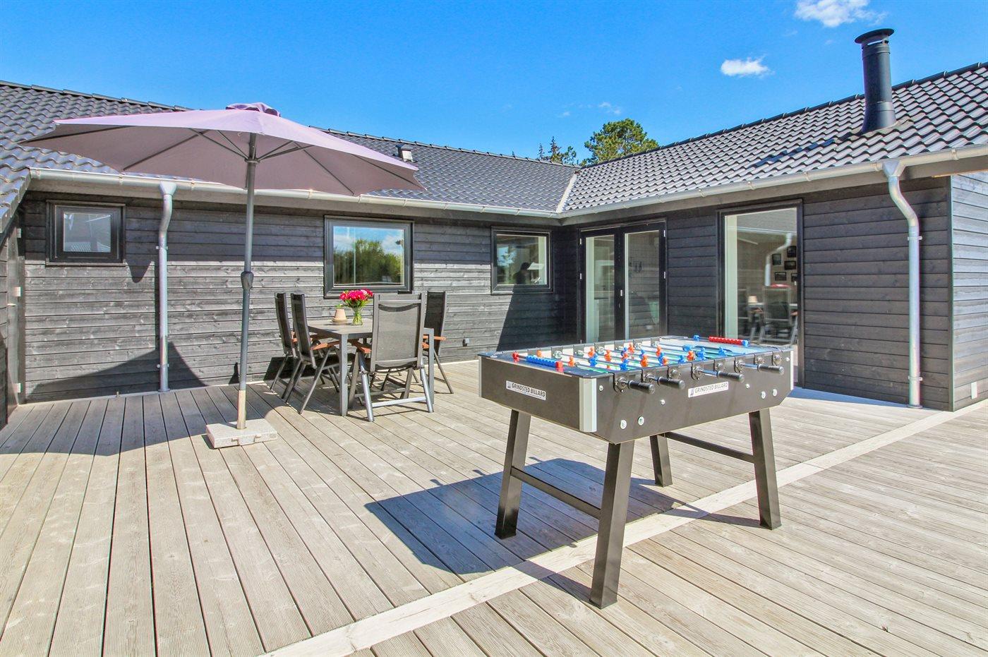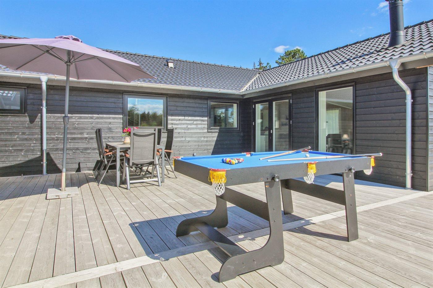 Et flot sommerhus til 10 personer med 5 gode soveværelser og stort disponibelt rum, hvor man kan finde poolbord, bordtennis og arkadespil mm. Fra den dejlige opholdsstue er der direkte adgang til terrassen, hvor der er god plads til hygge samt et vildmarksbad til ren afslapning.