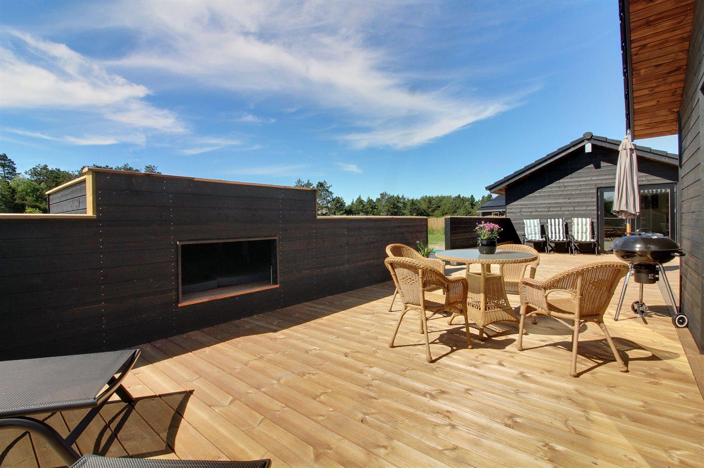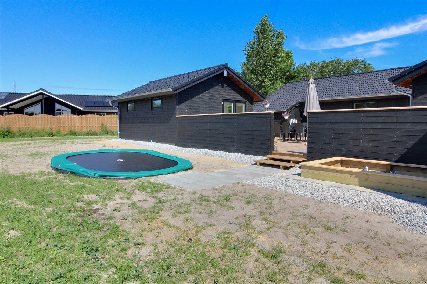 Ferieboligen er beliggende på en 1200 m² stor naturgrund. Der er 3300 m til havet. Der er 250 m til Vadehavet. Nærmeste forretning er beliggende i en afstand af 500 m. Der er en golfbane i en afstand af 900 m. Til ferieboligen hører 100 m² lukket terrasse. Der er redskabsrum. Gynge. Sandkasse. Trampolin. Shelter. Udendørs bruser. Grill til rådighed. Der er installeret stik til opladning af elbil. Parkering ved ferieboligen.
