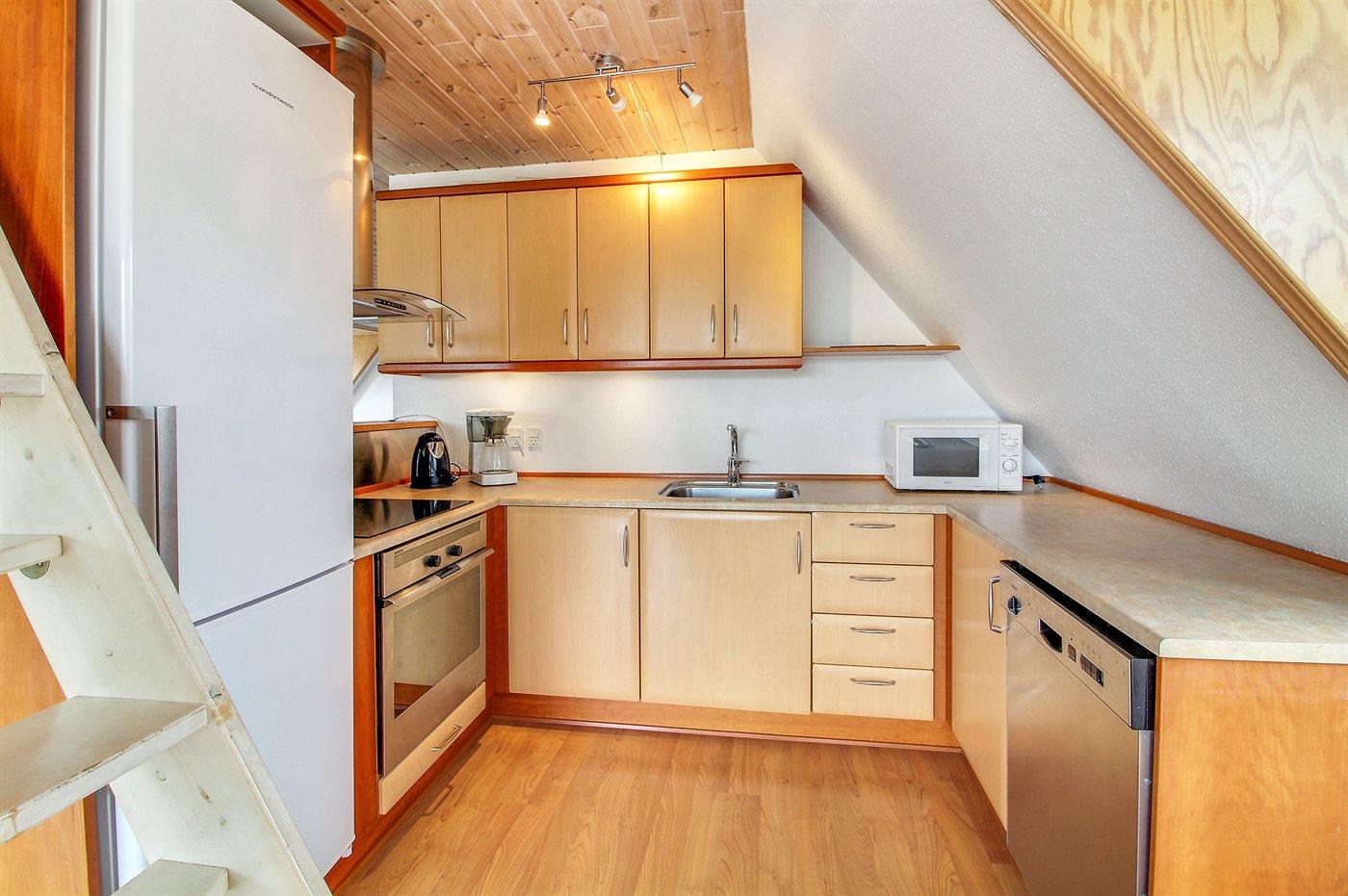 Køkkenet er udstyret med 1 køleskab. Der er 4 keramiske kogeplader, mikrobølgeovn.